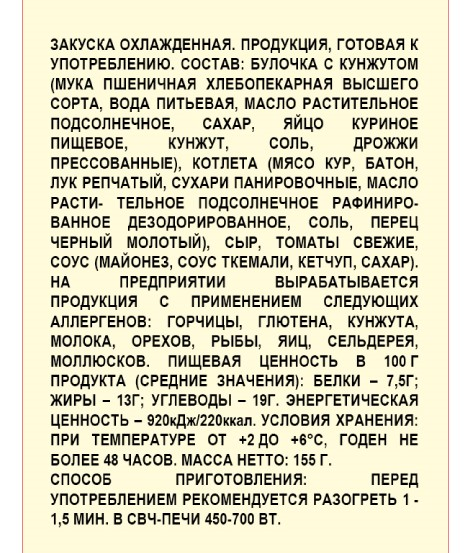 Булочка с кунжутом (мука пшеничная хлебопекарная высшего сорта, вода питьевая, сахар, яйцо куриное пищевое, кунжут, соль, дрожжи прессованные), котлета (мясо кур, батон, лук репчатый, сухари панировочные, масло растительное подсолнечное рафинированное дезодорированное, соль, перец черный молотый), сыр, томаты свежие, соус (майонез, соус Ткемали, кетчуп, сахар).