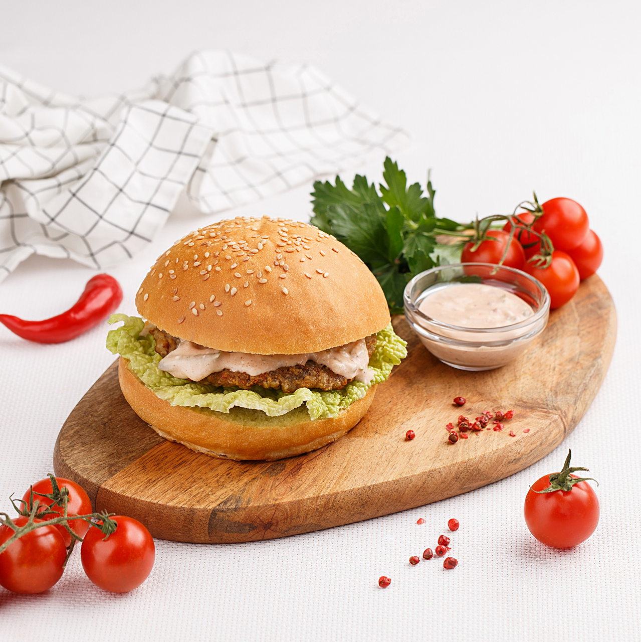 Сочная, нежная куриная котлета. Мягкий сыр и свежий, сочный помидор. Фирменный кисло-сладкий соус и булочка с кунжутом собственного производства.