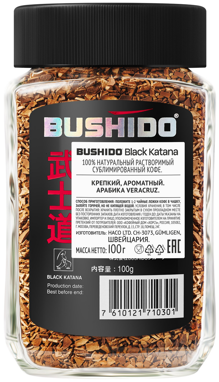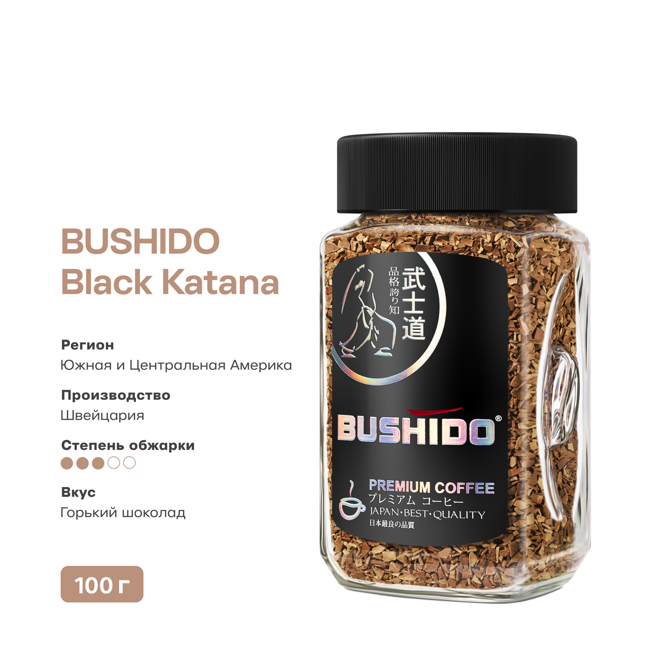 BUSHIDO Black Katana 100 г - растворимый сублимированный кофе из 100% премиальной арабики. Особый профиль обжарки придаёт деликатную крепость этому бленду, но, несмотря на горький шоколад в основе, его вкус получился сбалансированным и без лишней терпкости. Обжарка CITY раскрывает глубину вкуса. BUSHIDO - смелый эксперимент по объединению японской философии и европейской кофейной культуры.