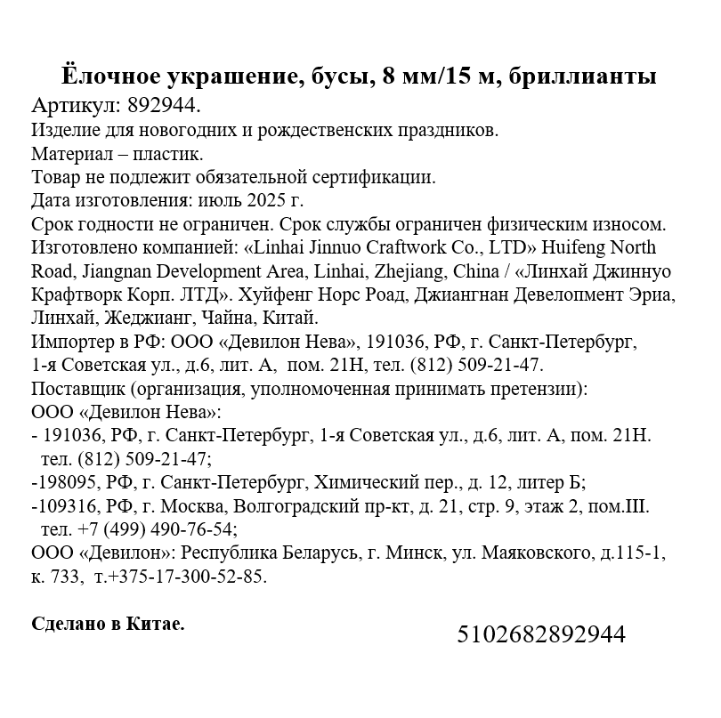 Бусы бриллианты 8мм, 15м - это тематический сувенир для подарков и праздничных композиций. Отлично подойдет для декорирования интерьера, будет эффектно смотреться на настенной ёлке, сделанной из бумаги, веток или гирлянд.