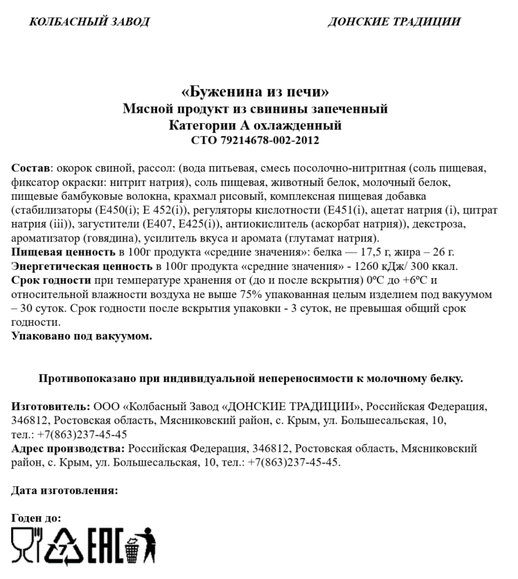 Буженина из печи запеченная, приготовлена в соответствии с классическими ожиданиями и характеристиками этого продукта для целевой аудитории нашей страны. Вырабатывается исключительно из свиного охлажденного окорока отечественного производства.