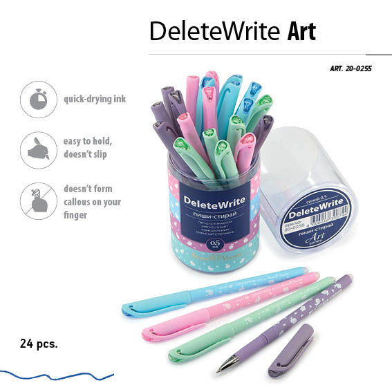 Вид упаковки: пластиковая туба. Вид чернил: гелевые термочувствительные стираемые чернила. Диаметр корпуса ручки: 8.5 мм. Длина ручки: 145 мм. Длина стержня: 130 мм. Клип: пластиковый. Материал корпуса: пластик. Металлизированный наконечник: да. Наличие грипа: да. Специальное покрытие: корпус Soft Touch. Тип письма: мягкое письмо. Тип пишущего узла: пулевидный. Тип ручки: со сменным стержнем. Тип чернил: гелевая пиши-стирай. Толщина пишущего узла: 0.5 мм. Цвет чернил: синий. Цветовая концепция: Art.