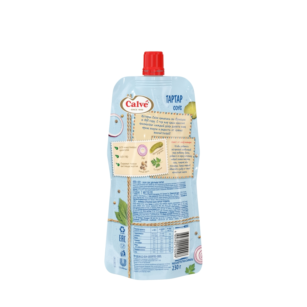 Соус Calve Тартар для рыбы, 230г.Тартар - это соус для рыбы и морепродуктов, секрет которого в особенномсочетании сливочного вкуса, приправ, зелени и маринованных огурцов.Состав: вода, масло подсолнечное, яичный желток, загустители: Е1422 и ксантовая камедь, уксус столовый, огурчики маринованные, сушеные овощи, специи и пряности (лук репчатый, перец белый, петрушка), сахар, соль, ароматизаторы горчицы, регулятор кислотности молочная кислота, консервант сорбиновая кислота, антиокислитель Е385, краситель бета-каторин. Пищевая ценность: белки- 0,8г, жиры- 35г, углеводы- 6,4г.Энергетическая ценность: 340ккал.Хранить: при t от 0'C до +24'C.Открытую упаковку хранить в холодильнике.Срок годности 7 месяцев.