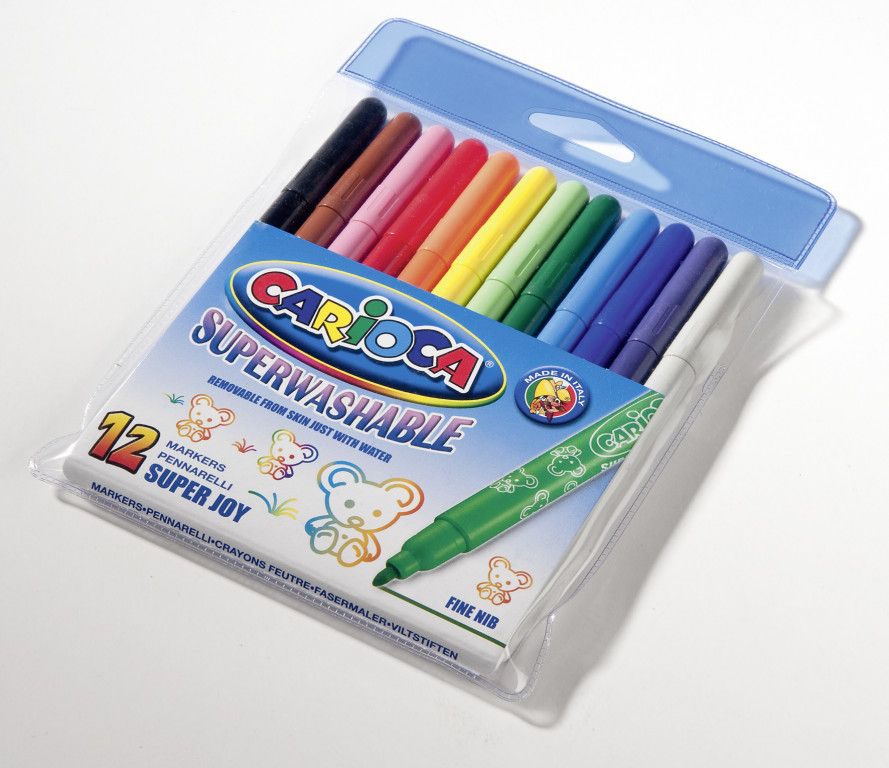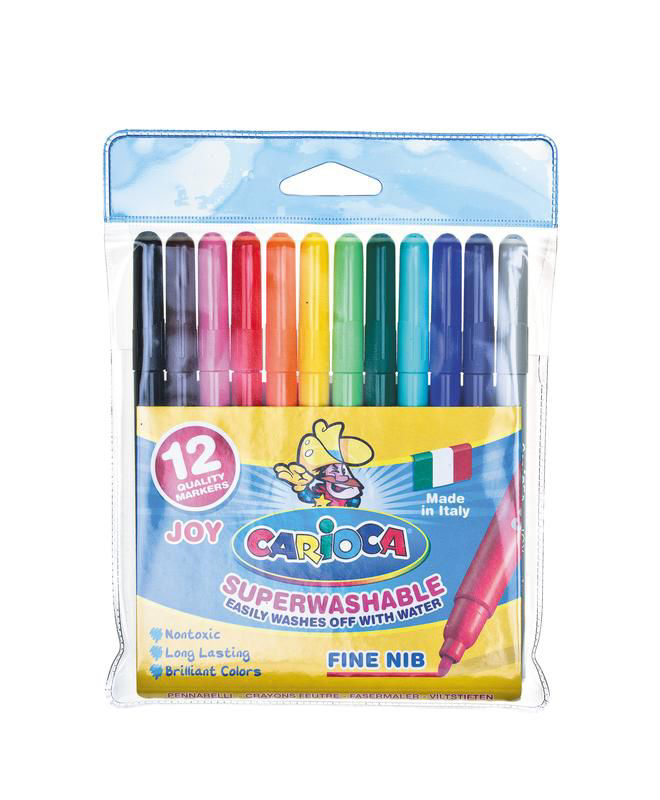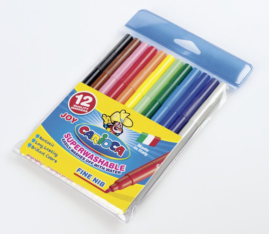 Фломастеры для рисования, раскрашивания и письма на бумаге, 12 цветов. Чернила изготовлены на водной основе, нетоксичны. Легко смываются с рук и большинства тканей. Каждый фломастер оснащен безопасным вентилируемым колпачком. Толщина линии: 1 мм. Срок годности: 24 месяца.