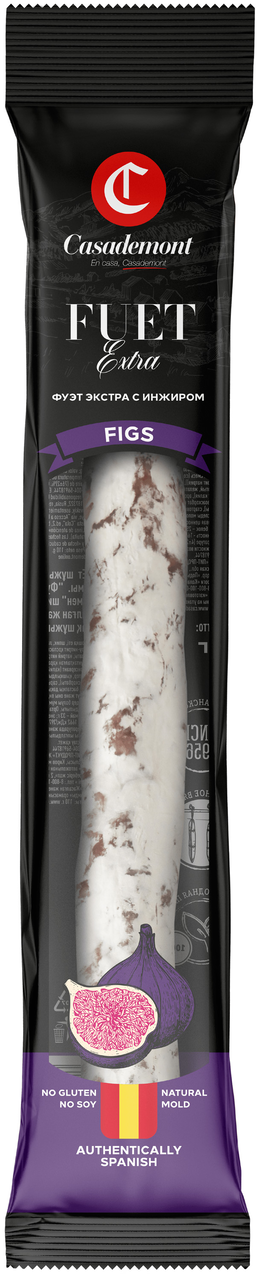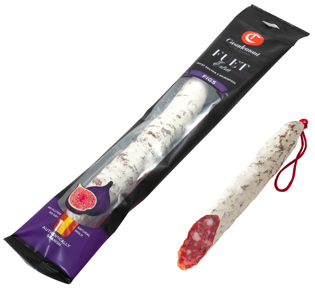 Колбаса Casademont Fuet Extra сыровяленая с инжиром, 110 г – изысканный сыровяленный продукт для тех, кто чтит вкус нежного мяса. Имеет средне-крупную структуру с сохранением фактуры мяса и небольшими жировыми вкраплениями. Отлично подходит для быстрого перекуса в составе бутербродов или сэндвичей. Также широко используется для приготовления различных блюд, в частности салатов, запеканок и пиццы. Кроме неповторимых ароматических и вкусовых свойств, для сыровяленной колбасы свойственна плотная и упругая структура. Особенность продукта - добавление инжира.