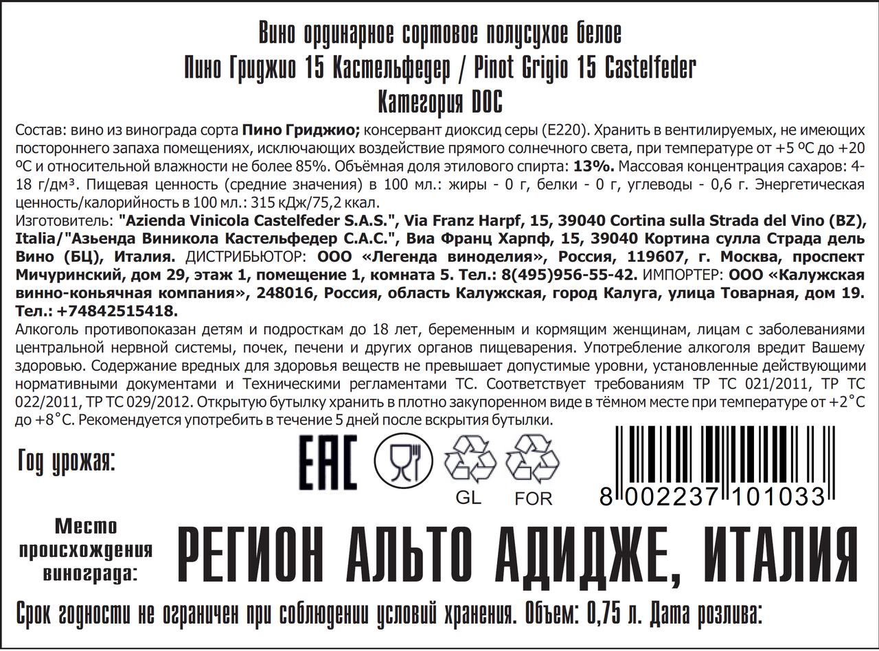 Виноград: Пино Гриджио 100%, антиокислитель (консервант) диоксид серы.