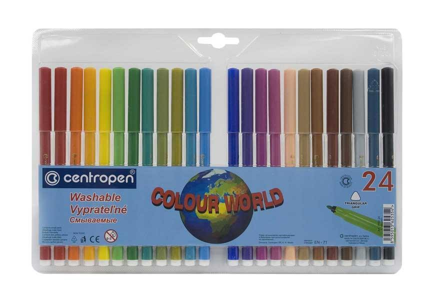 Фломастеры CENTROPEN Color World 24 цвета подойдут как для детей дошкольного и школьного возраста, так и для взрослых, занятых художественным творчеством. Принадлежности для рисования представлены в широкой цветовой палитре, что позволяет создавать красочные и полноцветные картины и иллюстрации. Фломастеры помещены в пластиковый корпус эргономичной формы, который комфортно удерживается пальцами и не вызывает усталости и напряжения в ру��е даже после продолжительной работы. Пишущий узел цилиндрической конструкции оставляет четкие и ясно различимые линии толщиной от одного до двух мм и устойчив к вдавливанию даже при сильном нажатии. Чернила фломастеров созданы на водной основе, не имеют неприятного запаха и без проблем смываются водой с моющим средством при случайном попадании на руки или одежду. Защитить их от преждевременного пересыхания помогают входящие в комплект колпачки с безопасной вентилируемой конструкцией. Набор фломастеров помещен в практичную упаковку с расположенным в верхней части европодвесом.