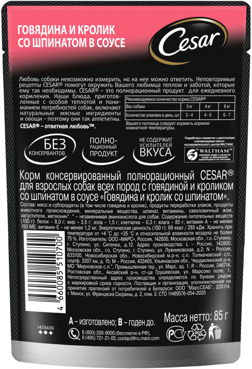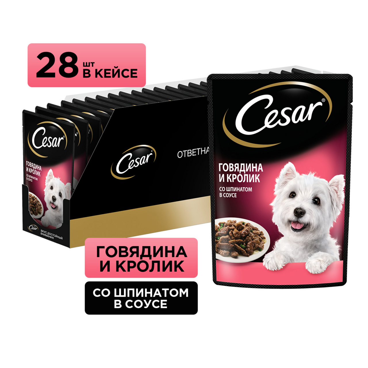Корм влажный Cesar соус для собак говядина и кролик со шпинатом, 85г