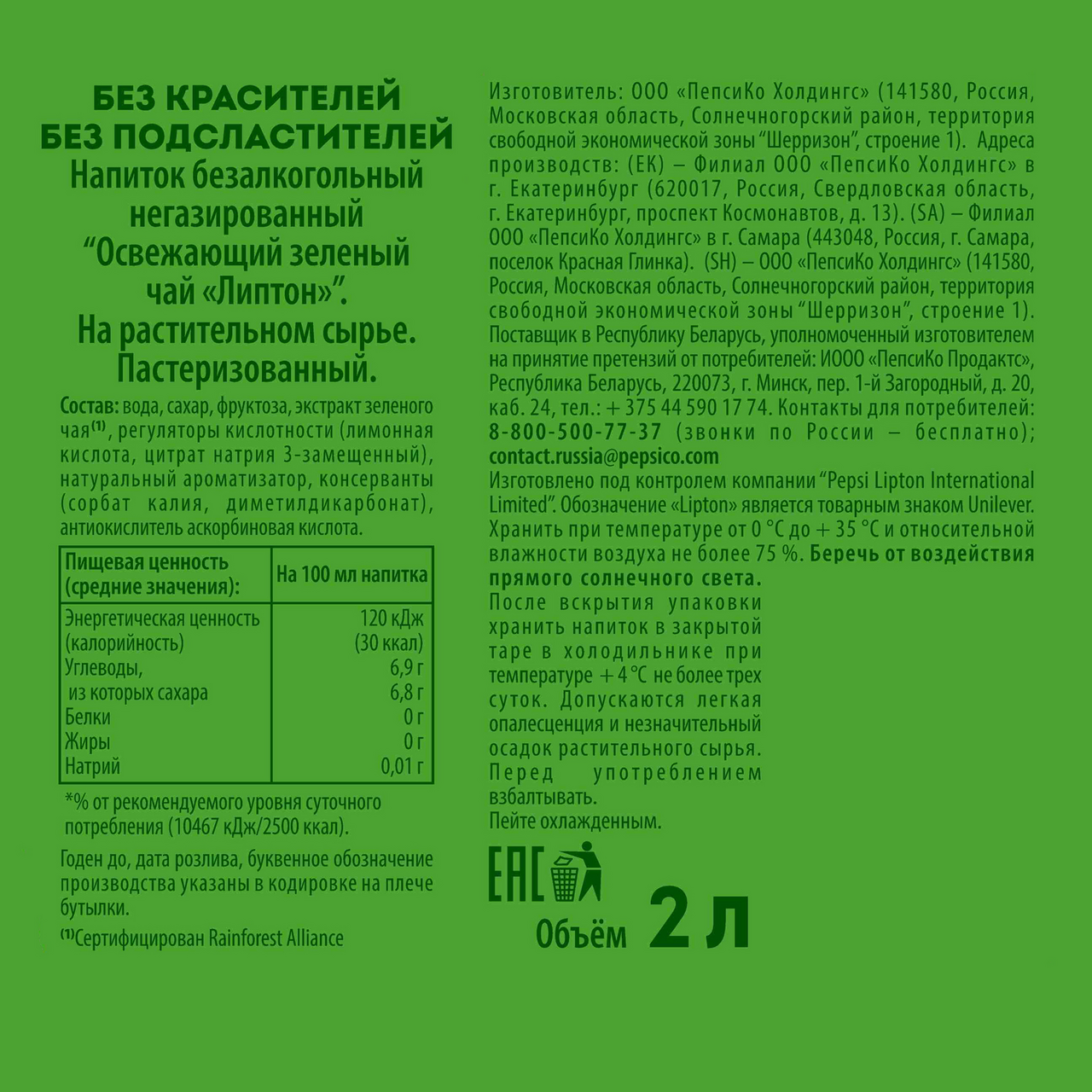 Холодный чай Lipton Зеленый Зеленый Чай безалкогольный 2л ПЭТ
