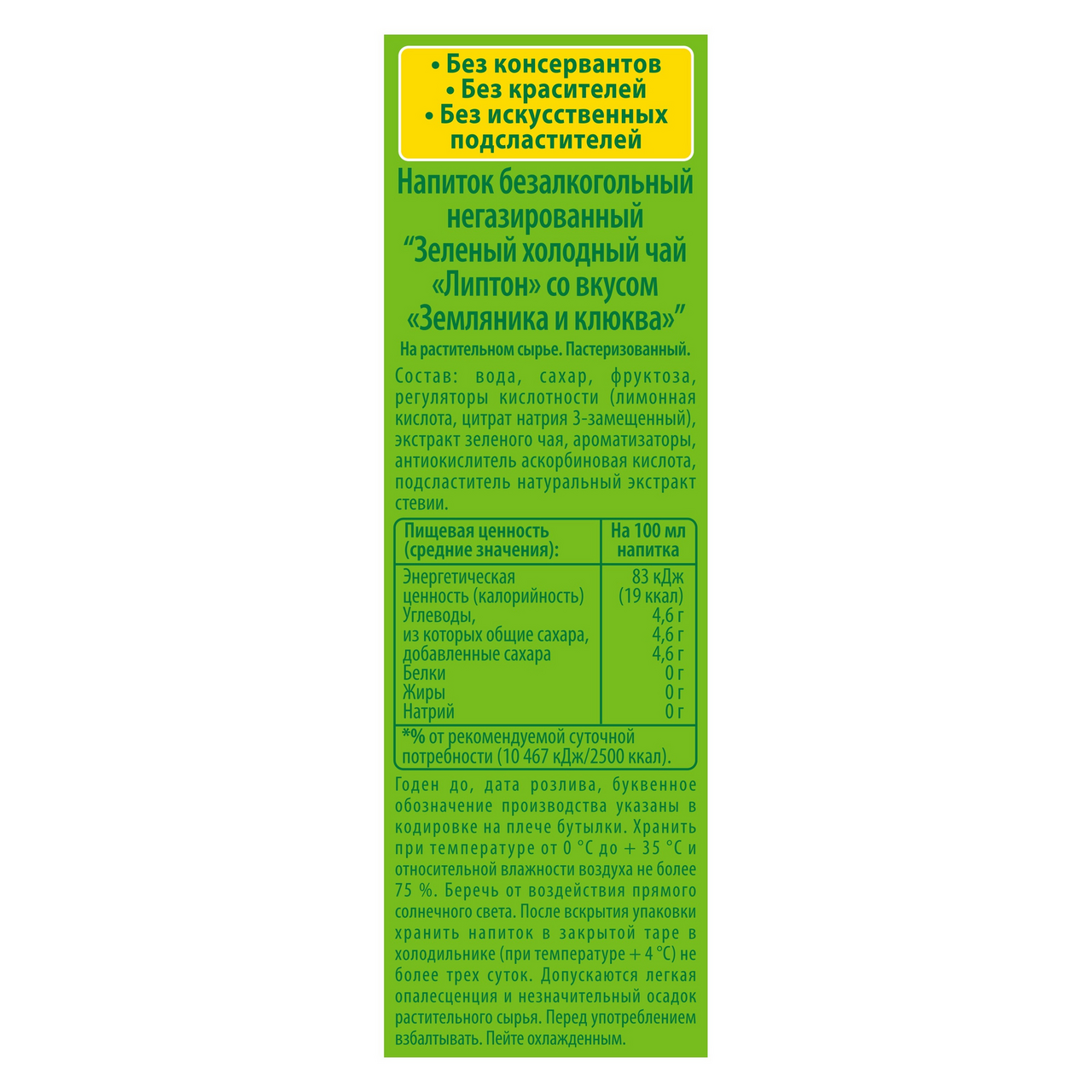 Холодный зеленый чай Липтон с освежающим вкусом земляники и клюквы - твое второе дыхание! ?С экстрактом зеленого чая. Без подсластителей. Без консервантов. Без красителей. На растительном сырье. Пастеризованный. ?Польза зелёного чая со вкусом лесной земляники и клюквы. ?Идеальный формат для большой компании ?Пейте охлаждённым Родиной холодного чая является США, самое раннее упоминание о реце��те этого жаждоутояющего, прохладительного напитка было обнаруженно в поваренной книге 19 века. За это время холдный чай завоевал любовь миллионов потребителей по всему миру. Впервые компания Lipton выпустила бутилированный холодный чай в 1991 году , на сегодняшний день Lipton Ice Tea является лидером в категории холодного чая на рынке в России и во многих других странах. В портфеле Lipton ice tea широкая линейка вкусов и форматов какой бы вы из них не выбрали Lipton гарантирует великолепный вкус в сочетании лучших ингредиентов.