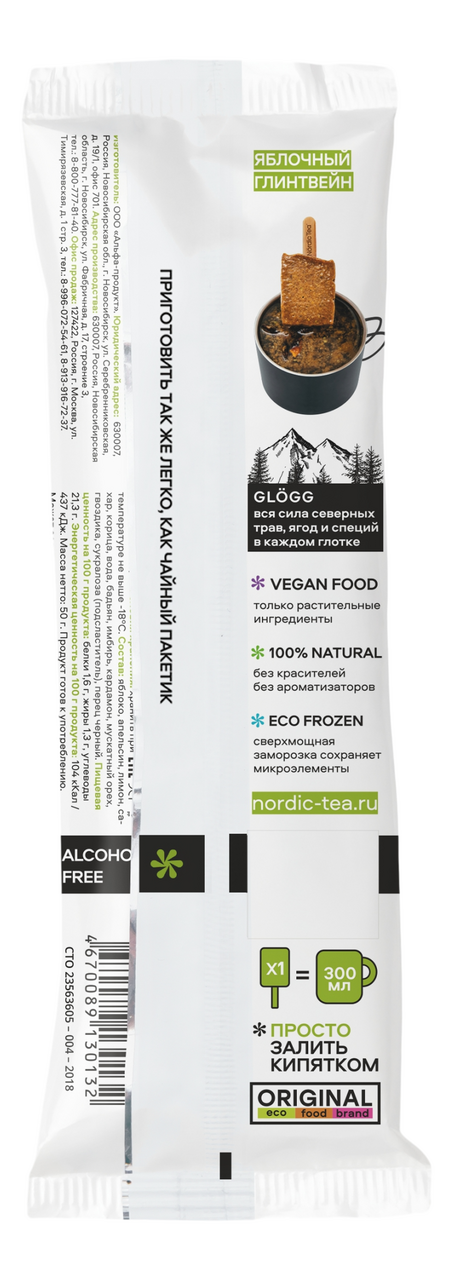 Чай Nordic tea яблочный глинтвейн, 50г готовится методом заливания основы горячей водой и настаивания в течение 30 секунд. В состав продукта входят полезные компоненты без добавления вредных веществ, ГМО и красителей.