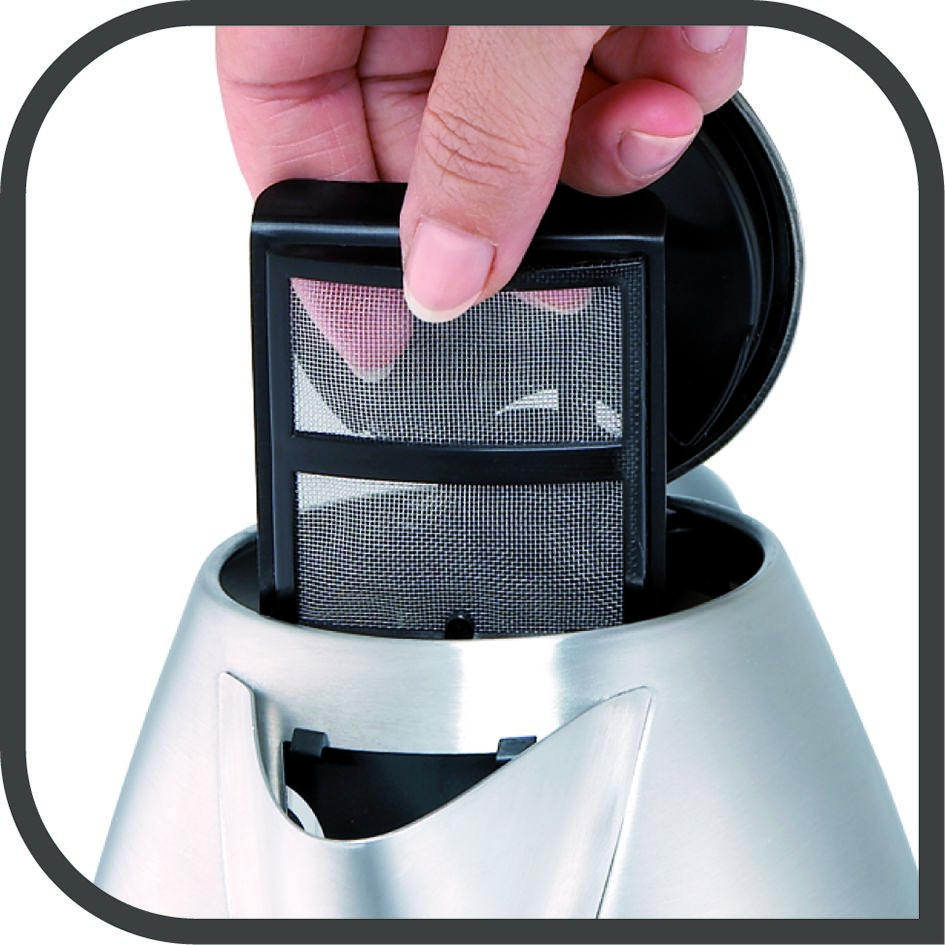 Электрический чайник мощностью 2400 Вт и объемом 1,7 л подойдет для длительного чаепития в компании семьи и друзей. Корпус чайника выполнен из нержавеющей стали и стильно смотрится в любом интерьере. Скрытый нагревательный элемент не имеет прямого контакта с водой. Вода в чайнике нагревается быстрее, а очистка от накипи становится легче и удобнее. Крышка открывается при нажатии на кнопку. Съемный фильтр в носике чайника предотвращает попадание накипи в кружку и легко чистится. Чайник устойчиво стоит на круглом основании, его можно поворачивать вокруг своей оси и брать с любой стороны.