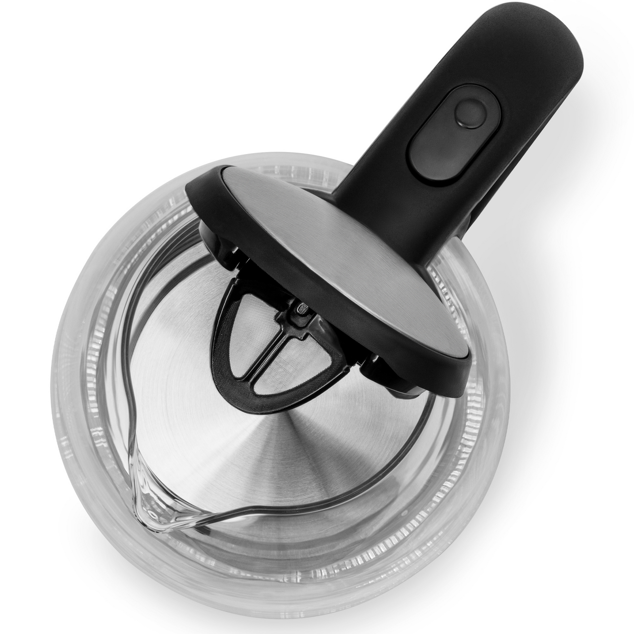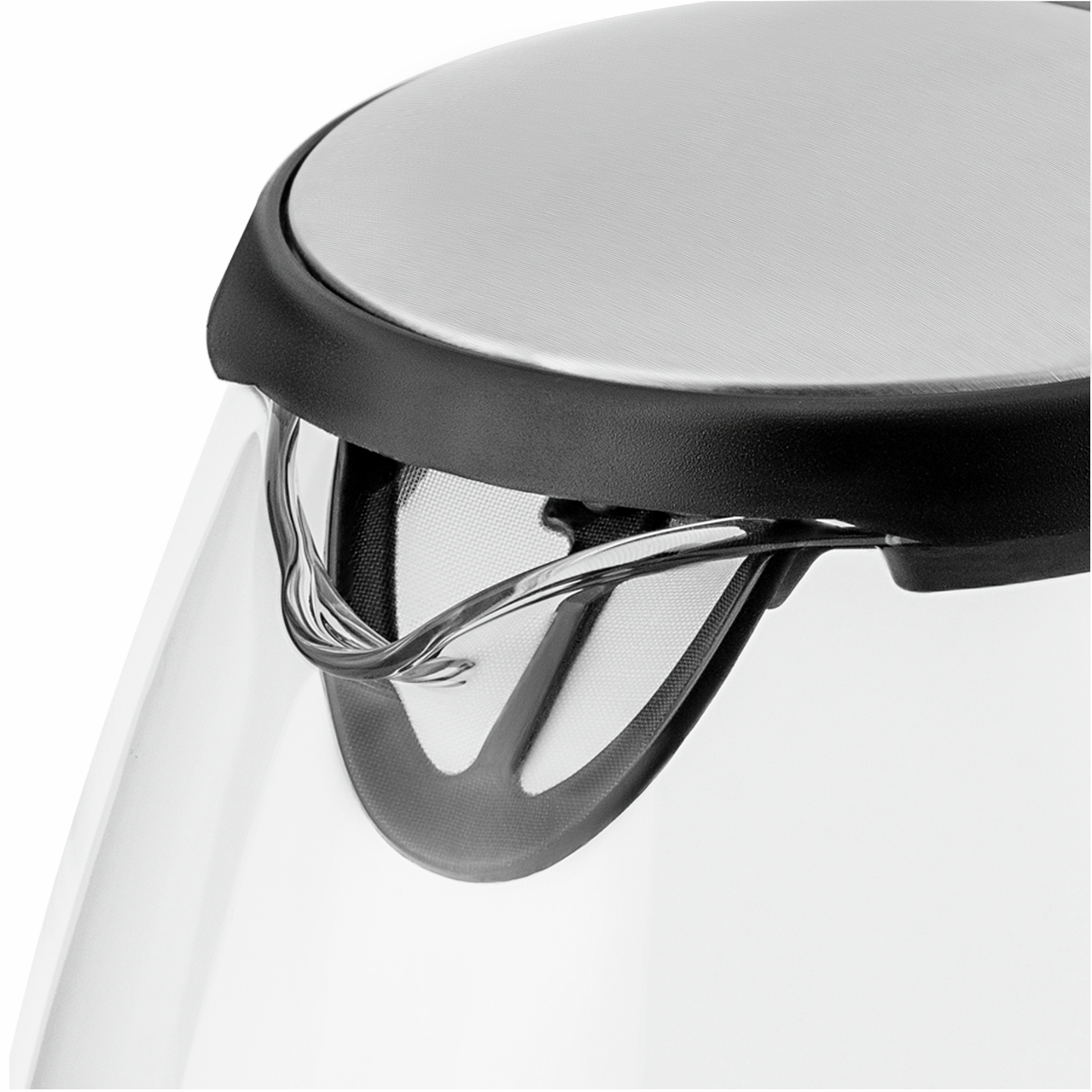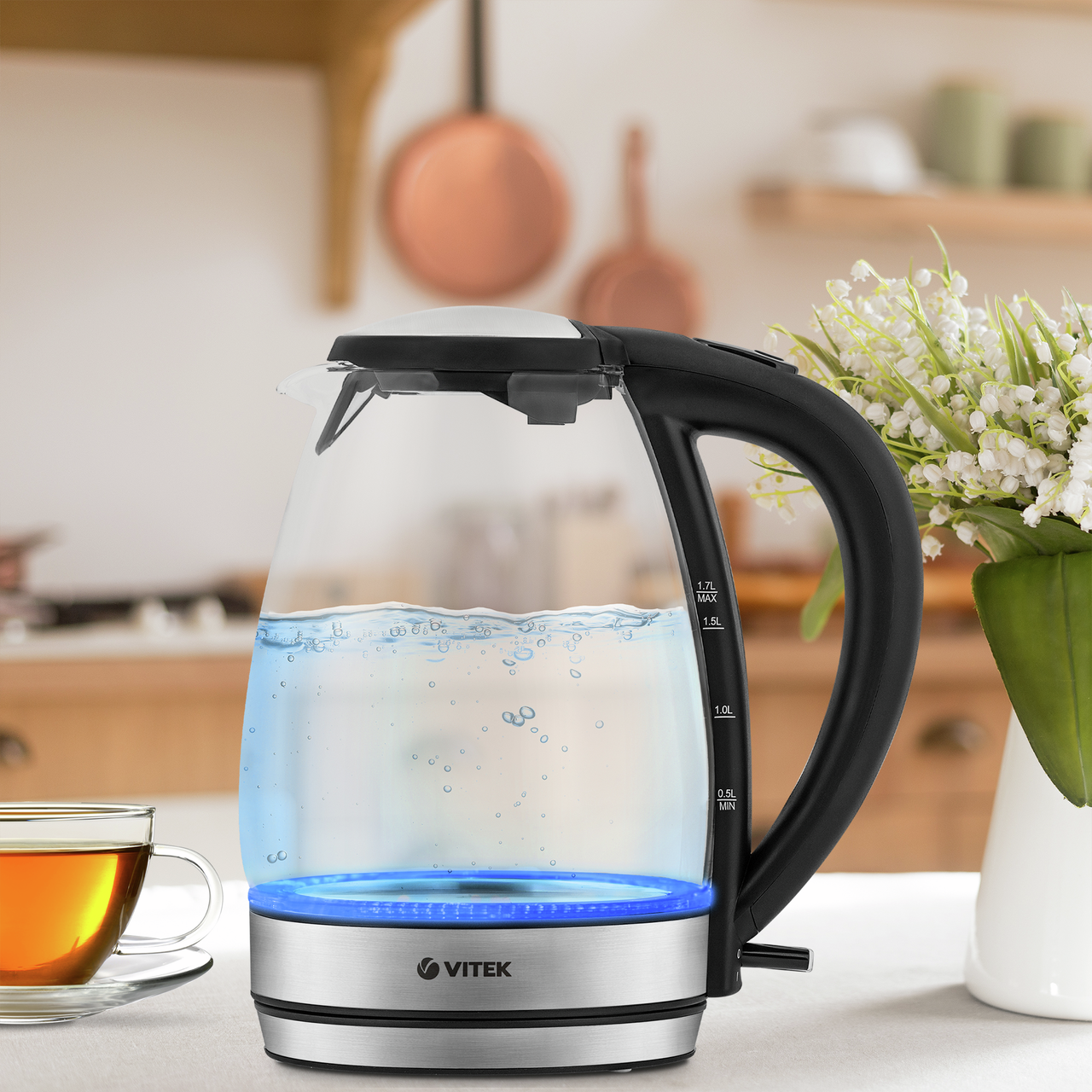 Чайник Vitek VT-7046 позволит быстро вскипятить или подогреть воду везде, где есть доступ к сети переменного тока. Прозрачный корпус модели выполнен из нержавеющей стали и термостойкого стекла – химически нейтрального материала, способного сохранить естественный вкус воды. На корпусе предусмотрена мерная шкала, с помощью которой удобно контролировать объем. При работе прибора включается LED-подсветка. Кнопки управления устройством расположены на термостойкой ручке. С их помощью можно включить прибор и плавно открыть крышку под углом 110 градусов. Широкое горлышко упрощает процесс чистки колбы и ее заполнения водой. Скрытый нагревательный элемент позволяет легко очистить колбу от накипи. Корпус прибора совмещается с базой, которая подключается к электросети и свободно вращается на 360 градусов, что позволяет устанавливать корпус в любом удобном для пользователя положении. При достижении температуры кипения прибор отключается автоматически.