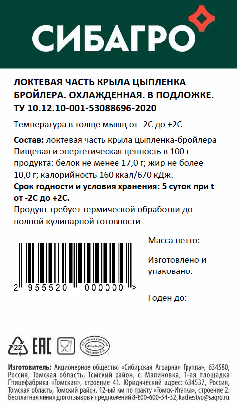 Локтевая часть крыла цыпленка-бройлера Сибагро охлажденная, ~1кг