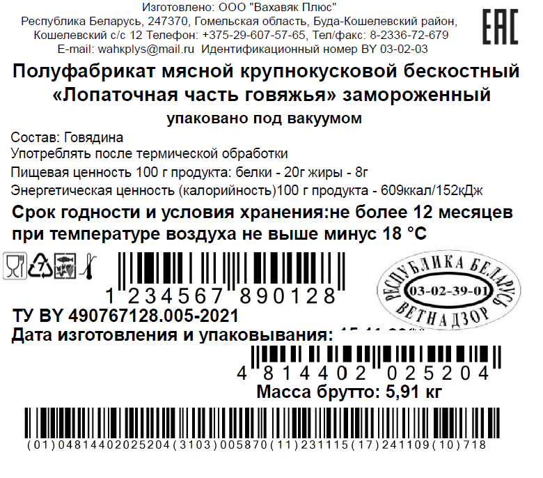 Часть лопаточная говяжья Вахавяк плюс замороженная, ~4.5кг