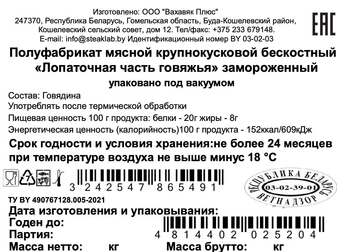 Часть лопаточная говяжья Вахавяк Плюс замороженная, ~5кг