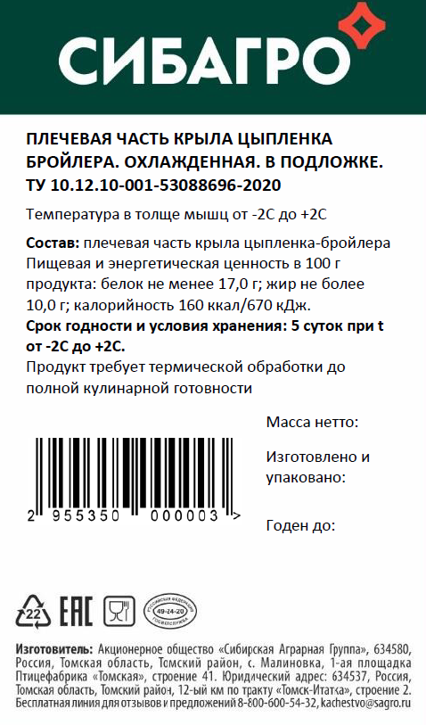 Часть плечевая крыла цыпленка-бройлера Сибагро охлажденная, ~1кг