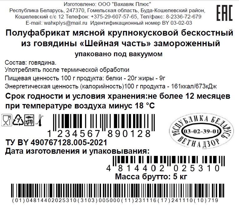 Часть шейная говяжья Вахавяк плюс замороженная, ~4.5кг