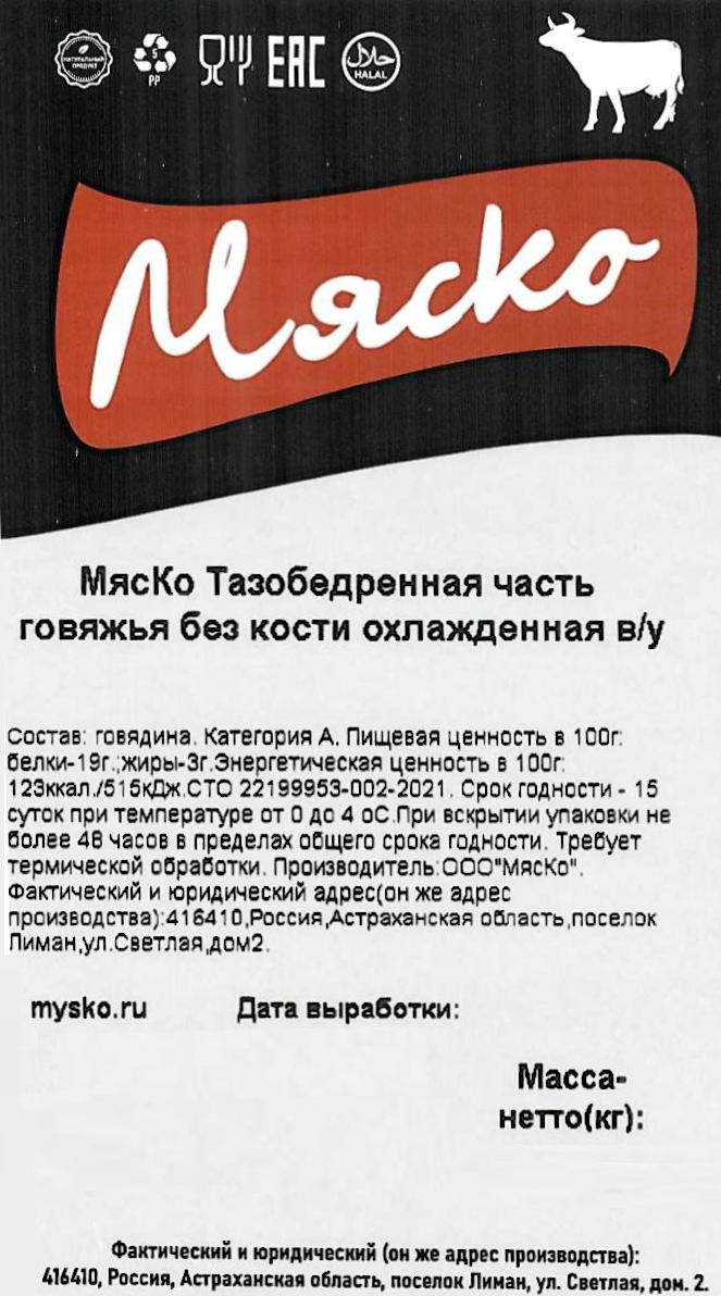 Часть тазобедренная говяжья Мяско Халяль бескостная охлажденная, ~900г