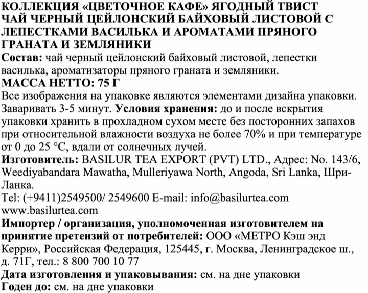 Чай черный цейлонский байховый листовой, лепестки василька, ароматизаторы пряного граната и земляники.