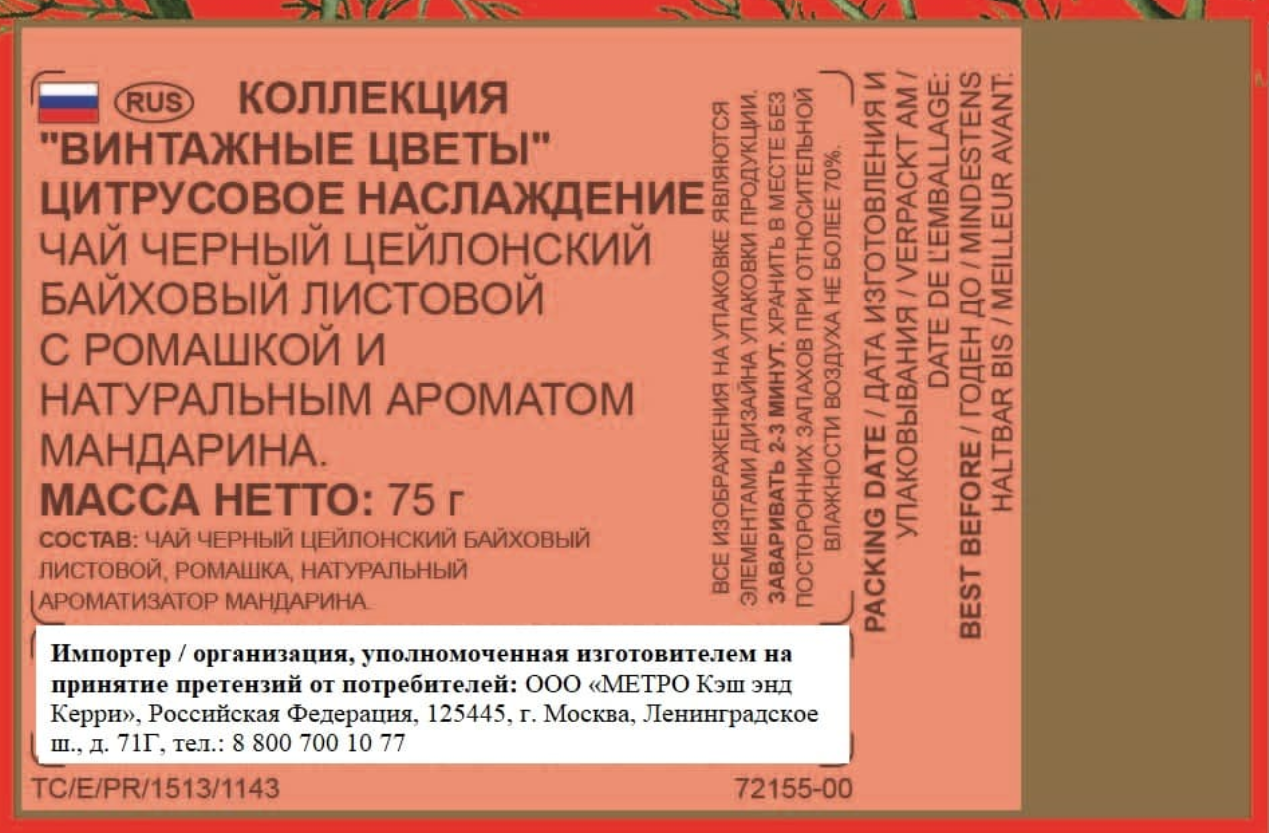 Чай черный цейлонский байховый листовой, ромашка, натуральный ароматизатор мандарина.
