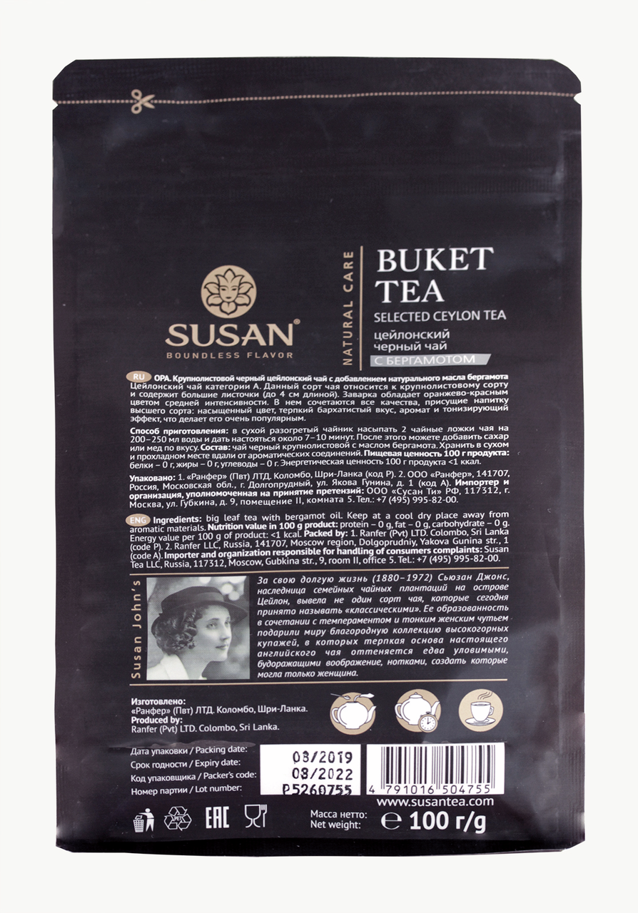 Чай с бергамотом Сусан Букет собран на острове Шри-Ланка, высокого качества, состоящий из отборных чайных листьев. Этот черный чай с натуральным маслом бергамота по-настоящему высоко оценен почитателями чая. В сравнении с другими видами цейлонского чая, Сусан расфасовывается сразу на месте производства, что позволяет максимально сохранить его вкусовые и ароматические свойства. Черный чай Сусан с бергамотом помещен в упаковку с зип-замком, в которой его удобно хранить после вскрытия.