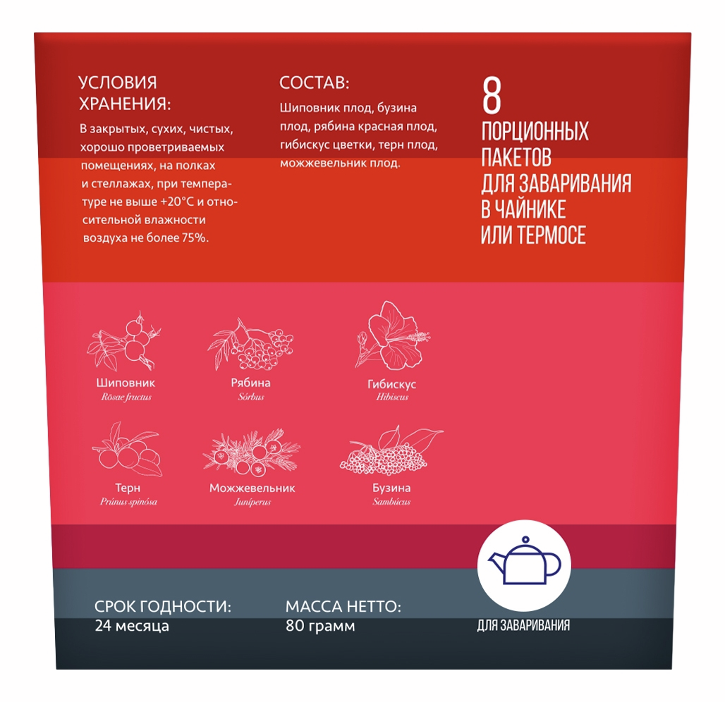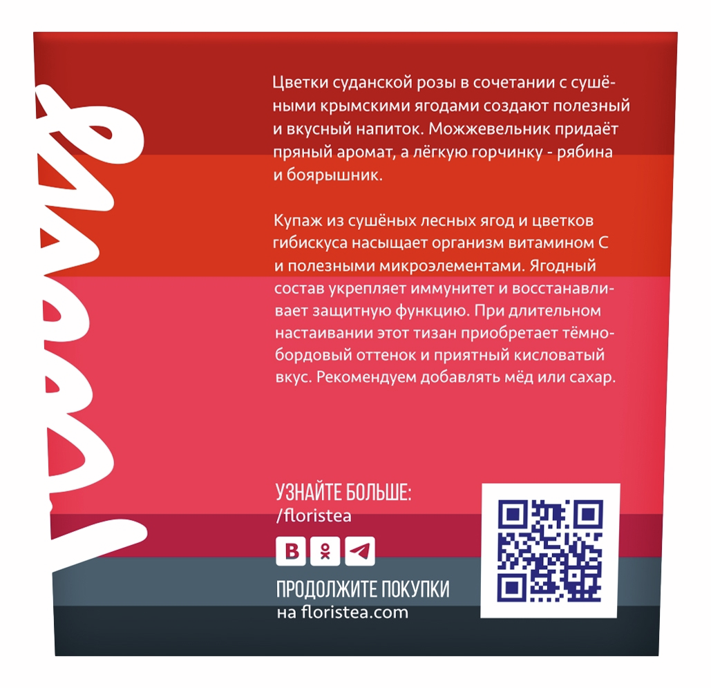 Цветки суданской розы в сочетании с сушеными крымскими ягодами создают полезный и вкусный напиток. Можжевельник придает пряный аромат, а легкую горчинку — рябина. Купаж из сушеных лесных ягод и цветков гибискуса насыщают организм витамином С. Состоит из измельченных плодов Шиповника (Rosa canina), черной Бузины (Sambcus ngra), Рябины красной (Srbus), Можжевельника обычного (Junperus commnis), Терна колючего (Prnus spinsa) и цветков суданской розы Гибискус (Hibiscus sabdariffa). Состав измельчен до фракции 1,5-2,5 мм, поэтому каждый ингредиент можно отчетливо рассмотреть. Купаж получается темно-бордового оттенка, с характерным ягодным вкусом. Для сладости можно добавить сахар или мед. Состав благоприятно влияет на сердечно-сосудистую, иммунную системы. Чай полезен в период сезонных заболеваний, ослабленном иммунитете, авитаминозе. Кисловатый и терпкий вкус поможет при укачивании или тошноте. В составе нет компонентов, содержащих кофеин, поэтому его можно пить в любом возрасте и перед сном.