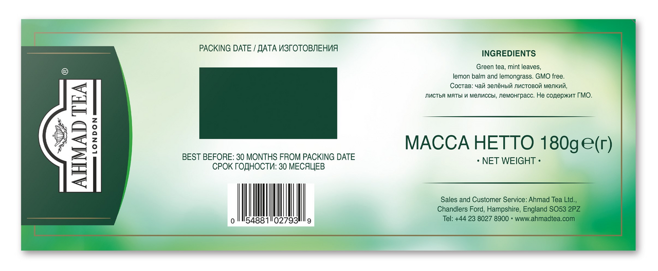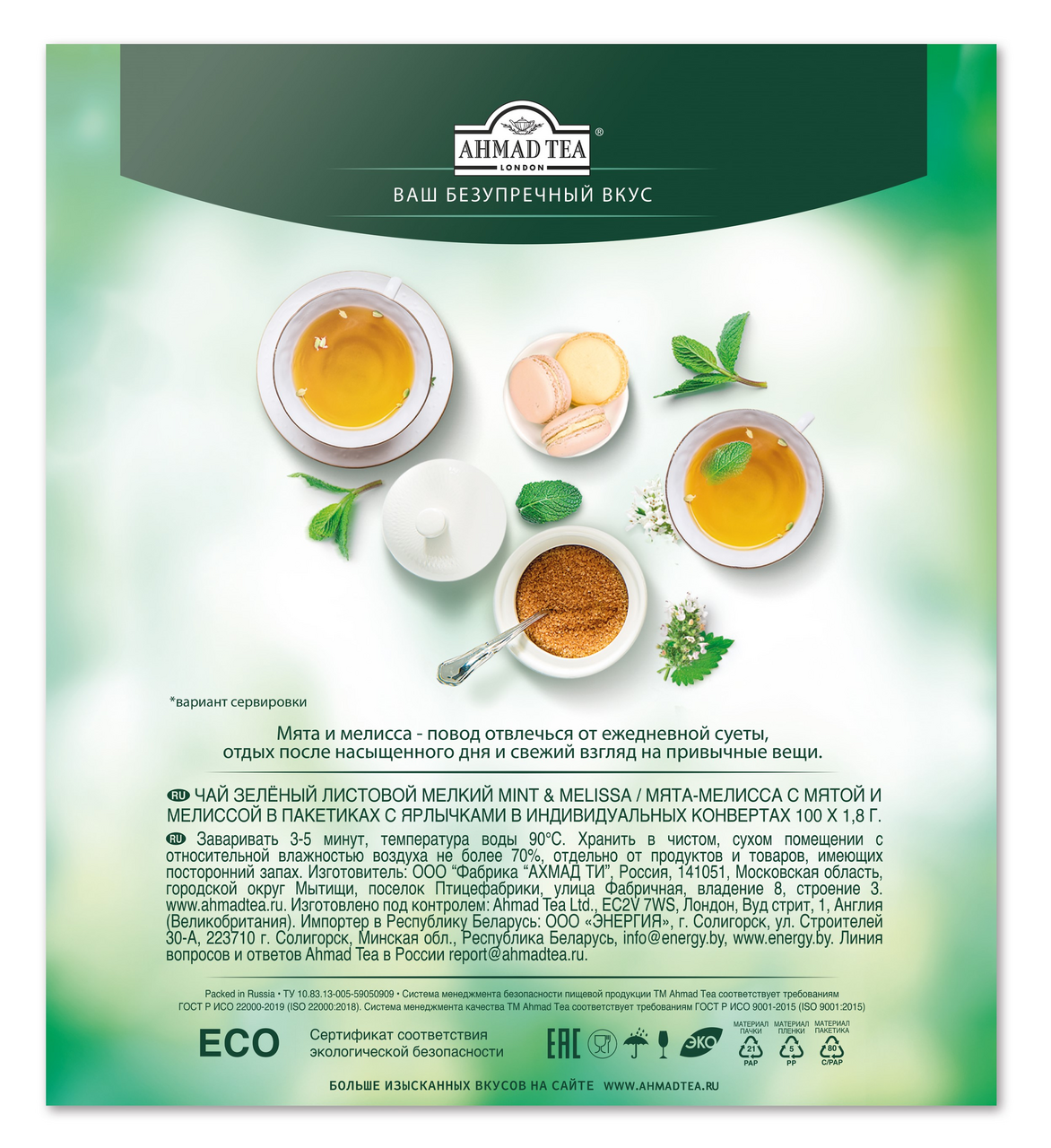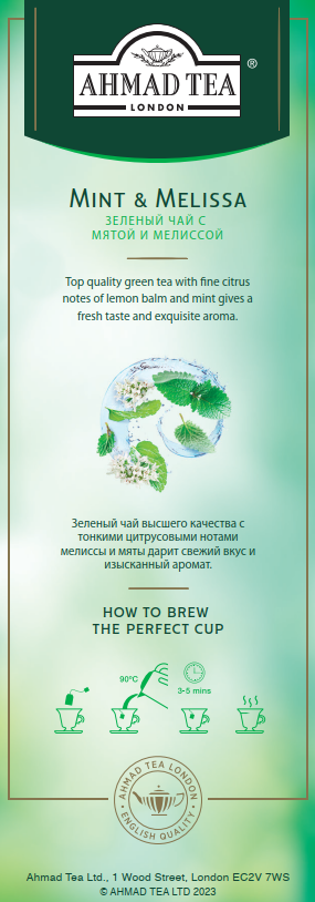 Новинка в ассортименте Ahmad Tea - зелёный чай с мятой и мелиссой. Зелёный чай высшего качества с тонкими цитрусовыми нотами мелиссы и мяты дарит свежий вкус и изысканный аромат. Mint & Melissa - повод отвлечься от ежедневной суеты, отдых после насыщенного дня и свежий взгляд на привычные вещи.