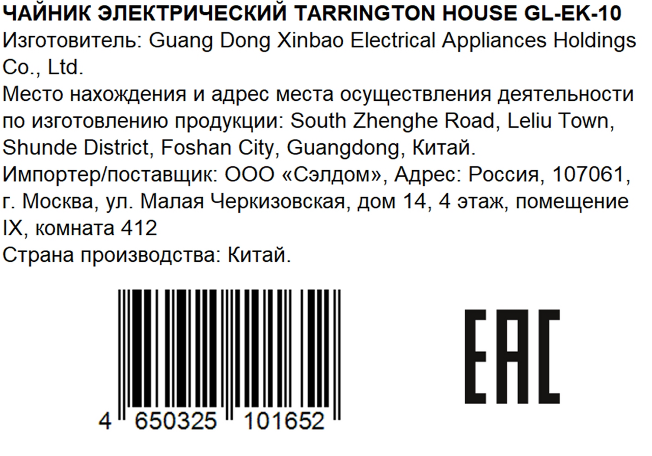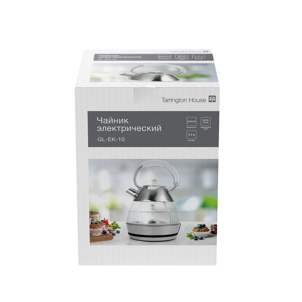 Tarrington House Чайник электрический GL-EK-10 – невероятно стильный кухонный аксессуар. Корпус прибора изготовлен из высококачественного прозрачного пластика и нержавеющей стали. ТЭН чайника закрыт, что обеспечивает дополнительную безопасность и высокую скорость закипания воды (не более 6 минут от комнатной температуры до 100 градусов Цельсия). Емкость чайника 1,7 л, чего достаточно для большой семьи даже из 6 человек. Внутренняя поверхность легко очищается от накипи с помощью специальных средств. Прозрачный корпус позволяет видеть количество воды в чайнике. Но в любом случае встроенная система безопасности не позволит включить прибор без жидкости – в устройстве имеется функция защиты от сухого включения. Как и другие аналогичные приборы, чайник отключается сам при закипании воды, поэтому вы не забудете про него. В крышку встроен датчик давления пара, под действием которого и происходит отключение. Стильный дизайн и необычная форма понравятся даже самому взыскательному покупателю. Серо-прозрачное исполнение отлично будет смотреться на современной кухне и сочетаться с другими кухонными приборами и кухонным гарнитуром.