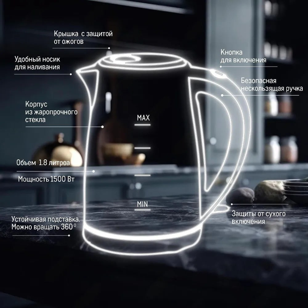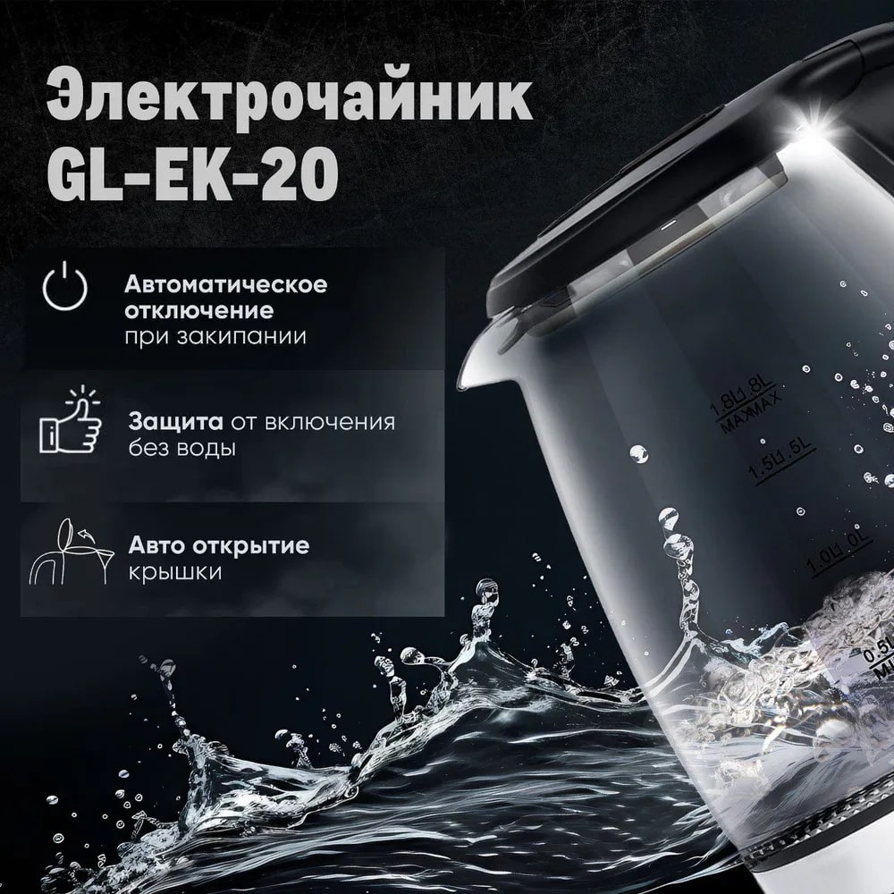 aro Чайник GL-EK-20 – отличный выбор как для дома и дачи, так и для офиса. Глянцевая металлическая поверхность способствует долгому сохранению тепла нагретой воды и отличается высокой прочностью к механическому воздействию. Плотно защелкивающаяся крышка легко открывается и закрывается. Пластиковая рукоятка обладает эргономичной конструкцией – она обеспечивает надежный хват и не скользит в руке, что позволяет предотвратить опрокидывания чайника. Кроме того, ручка практически не нагревается, что позволяет минимизировать риск получения ожога. Вода в резервуаре нагревается до 100 градусов за считаные минуты, что позволит избежать томительного ожидания кипятка для приготовления любимого напитка. Устройство оснащено подставкой, на которой чайник можно вращать в любую сторону н�� все 360 градусов без каких-либо препятствия. При закипании воды или ее отсутствии прибор отключается автоматически – это гарантирует безопасную эксплуатацию и обеспечивает большой ресурс работы. Питание осуществляется от стандартной электросети.
