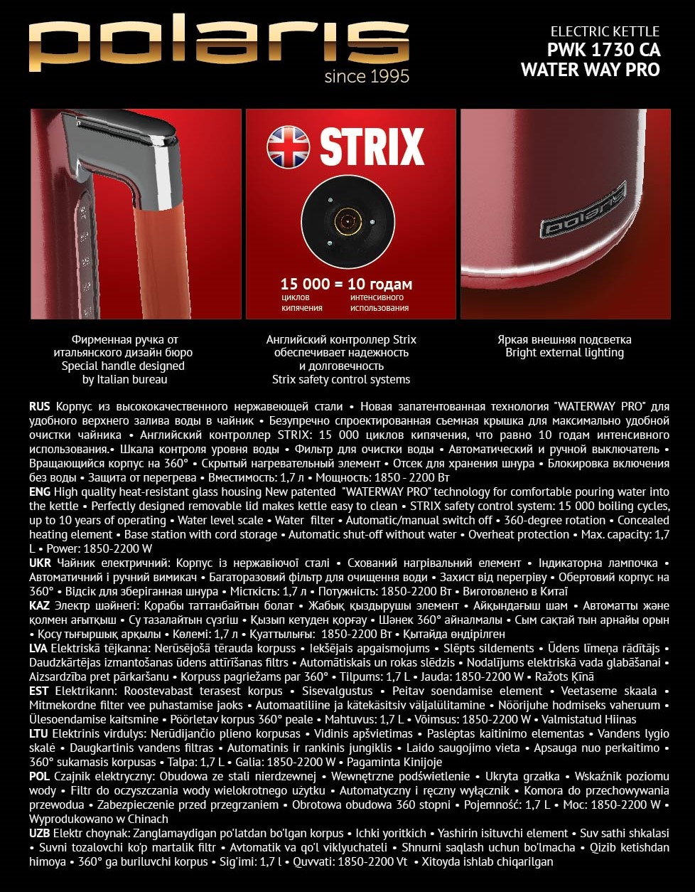 Чайник Polaris Water Way Pro PWK 1730 CA объемом 1,7 л за считаные минуты вскипятит воду. В нем установлен мощный закрытый нагревательный элемент в 2200 Вт. В устройстве предусмотрен специальный контроллер Strix. Он существенно продлевает срок эксплуатации изделия. Даже при интенсивном использовании оно прослужит не менее 10 лет. Прибор можно поставить на барную стойку в кафе, барах, ресторанах и других заведениях общественного питания или приобрести для личного пользования. Эта модель привлекает внимание стильным дизайном. Классическую форму подчеркивает яркая подсветка, которая включается во время работы. Она одинаково эффектно смотрится при дневном свете и в темноте. Пользоваться чайником удобно. Для того чтобы налить воду, крышку снимать не требуется. Специальная технология WATERWAY PRO позволяет добавлять воду через отверстие в середине крышки. Изделие соответствует всем требованиям безопасности. Прибор не включается при отсутствии воды и автоматически выключается при ее закипании, что предотвращает его перегрев или сгорание деталей. Ухаживать за электрочайником очень просто. Крышка легко снимается, что дает возможность помыть чайник изнутри. В инструкции имеются рекомендации производителя для удаления накипи, которая может появиться при использовании жесткой и нефильтрованной воды.