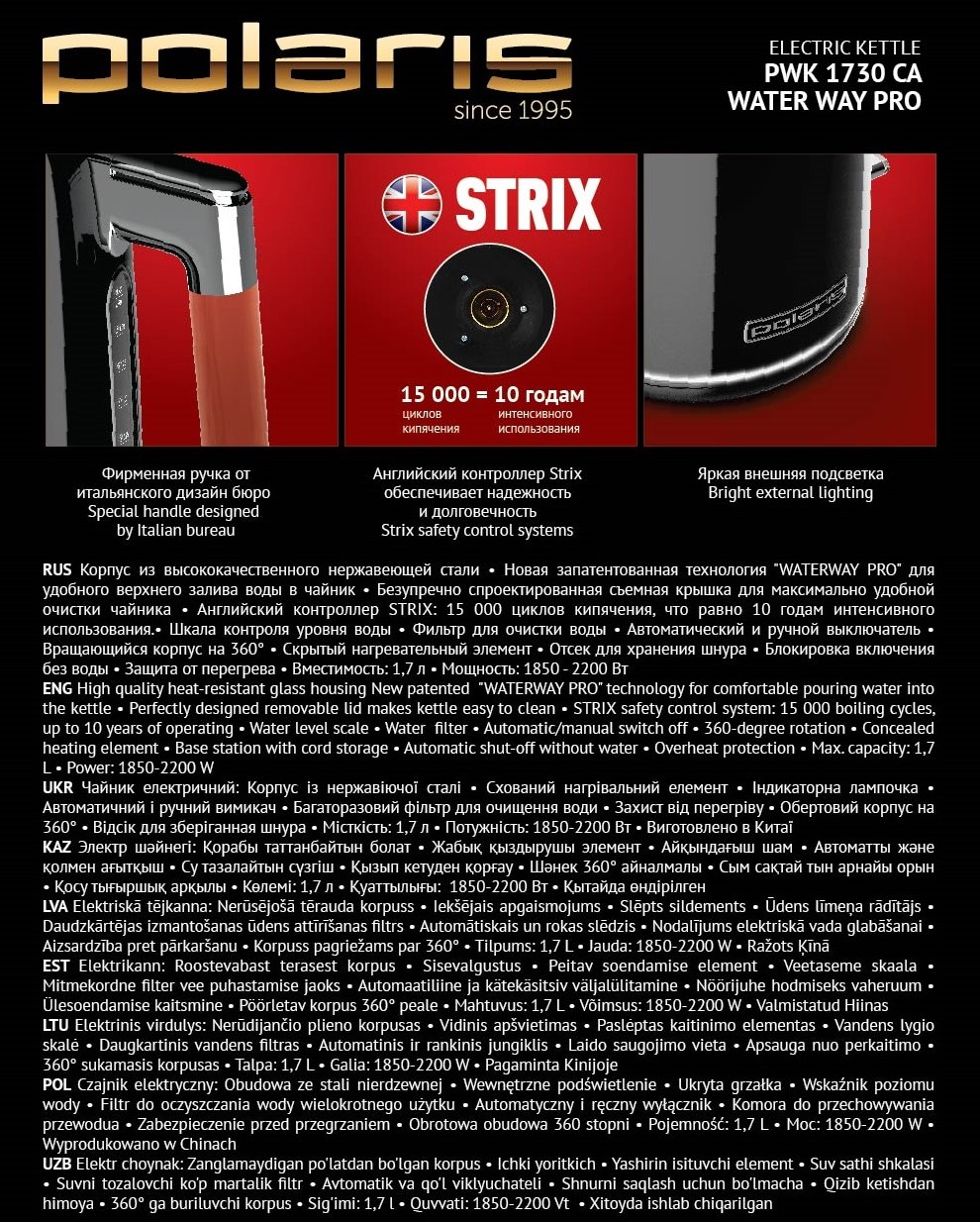 Чайник Polaris Water Way Pro PWK 1730 CA объемом 1,7 л за считаные минуты вскипятит воду. В нем установлен мощный закрытый нагревательный элемент в 2200 Вт. В устройстве предусмотрен специальный контроллер Strix. Он существенно продлевает срок эксплуатации изделия. Даже при интенсивном использовании оно прослужит не менее 10 лет. Прибор можно поставить на барную стойку в кафе, барах, ресторанах и других заведениях общественного питания или приобрести для личного пользования. Эта модель привлекает внимание стильным дизайном. Классическую форму подчеркивает яркая подсветка, которая включается во время работы. Она одинаково эффектно смотрится при дневном свете и в темноте. Пользоваться чайником удобно. Для того чтобы налить воду, крышку снимать не требуется. Специальн��я технология WATERWAY PRO позволяет добавлять воду через отверстие в середине крышки. Изделие соответствует всем требованиям безопасности. Прибор не включается при отсутствии воды и автоматически выключается при ее закипании, что предотвращает его перегрев или сгорание деталей. Ухаживать за электрочайником очень просто. Крышка легко снимается, что дает возможность помыть чайник изнутри. В инструкции имеются рекомендации производителя для удаления накипи, которая может появиться при использовании жесткой и нефильтрованной воды.