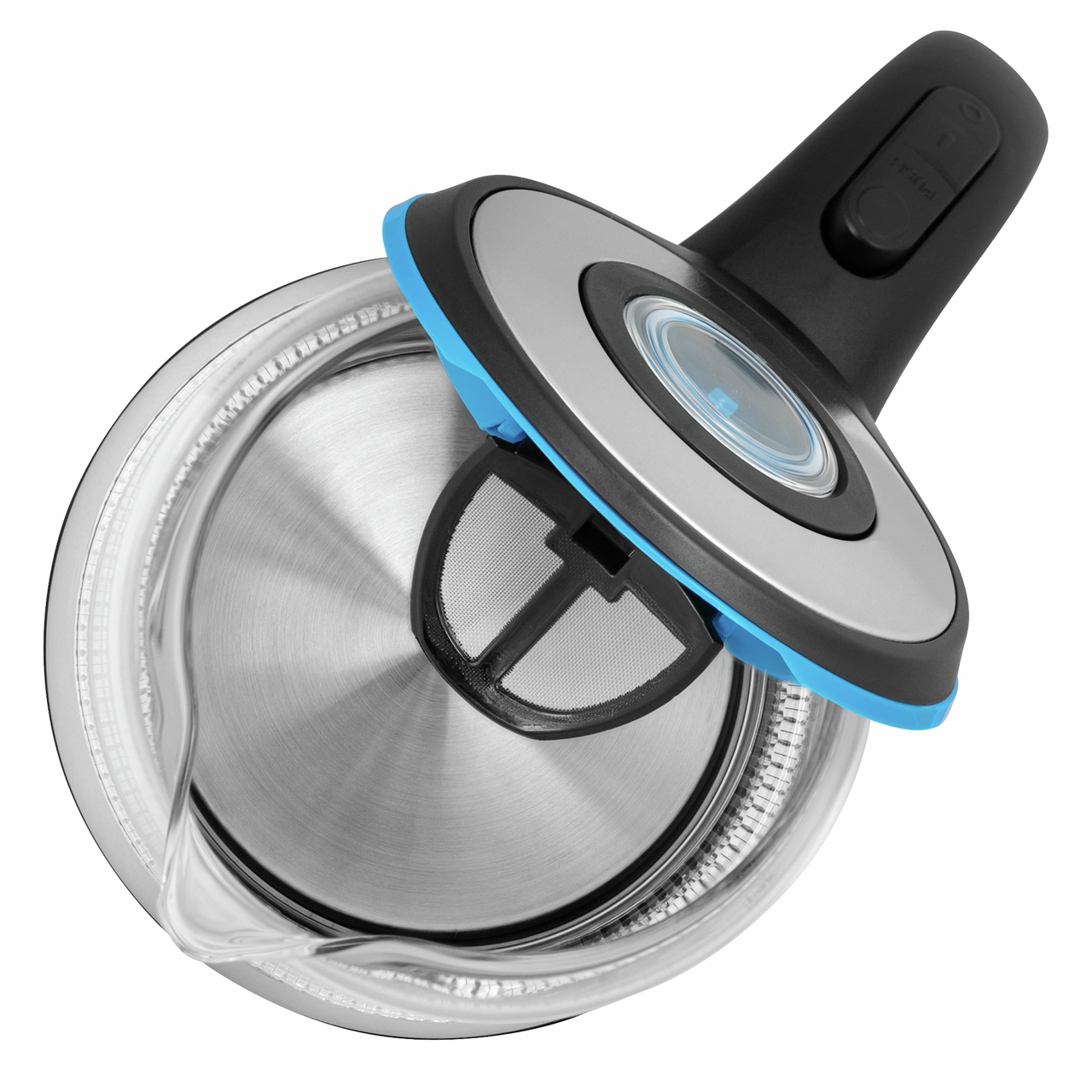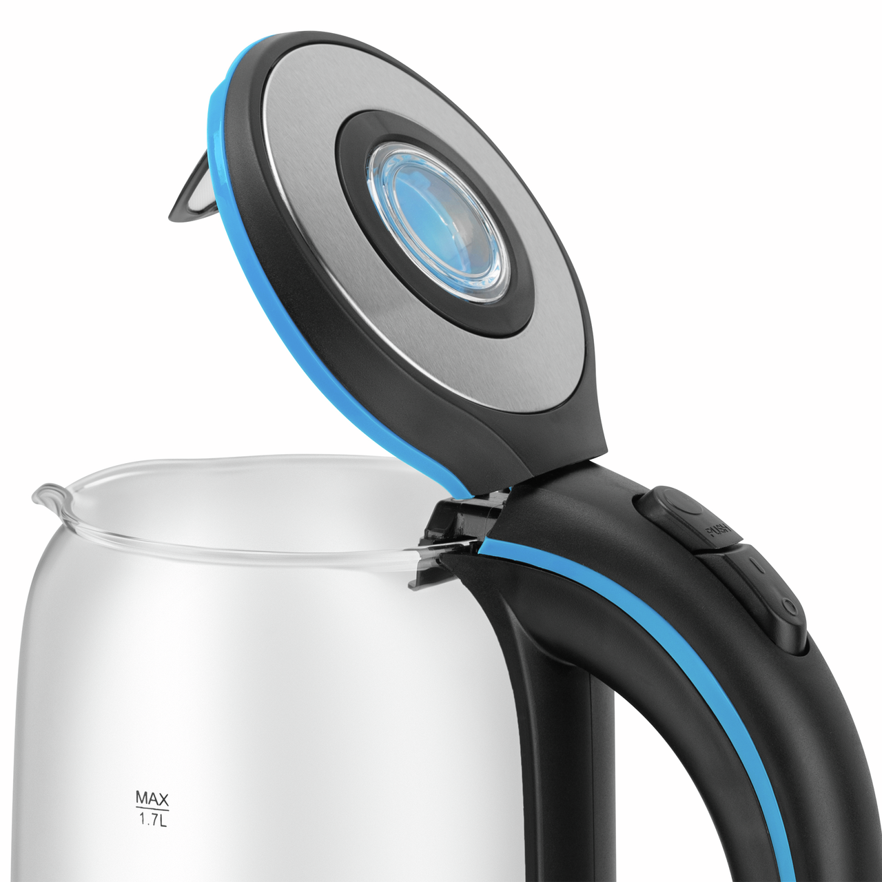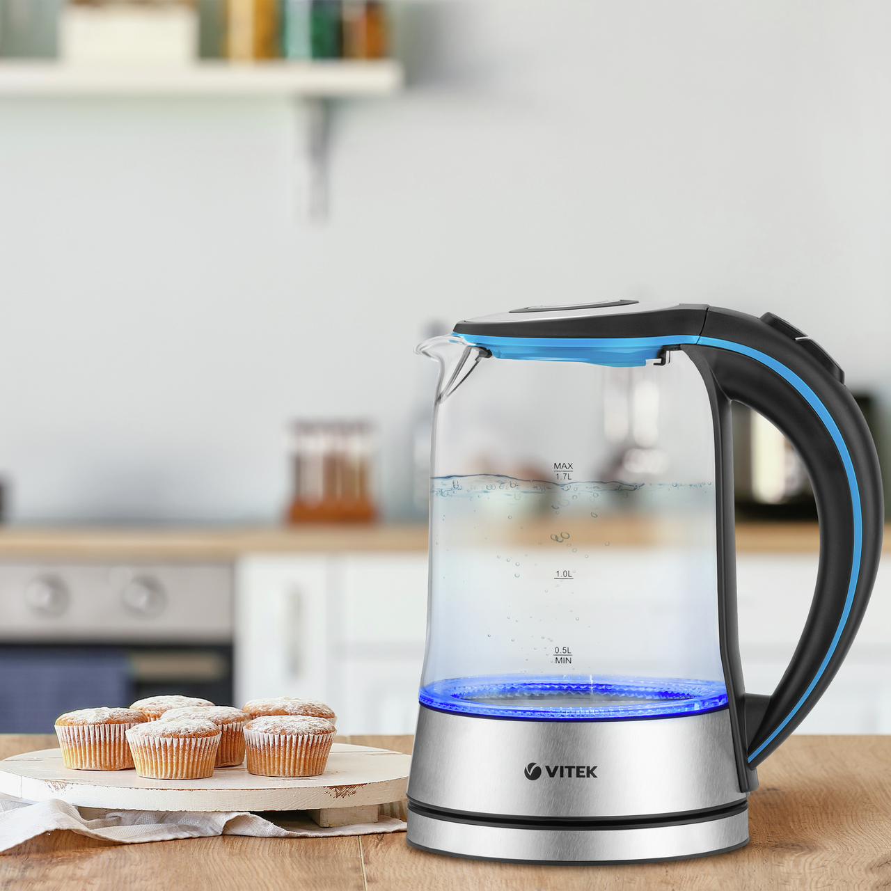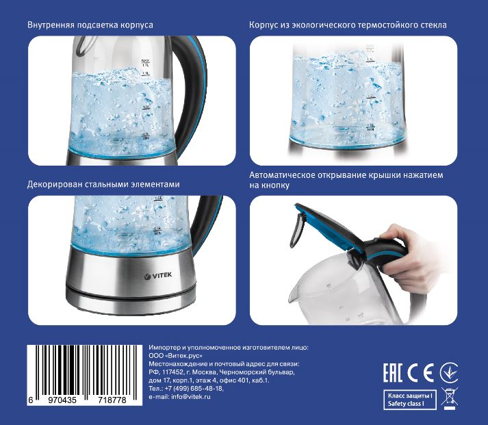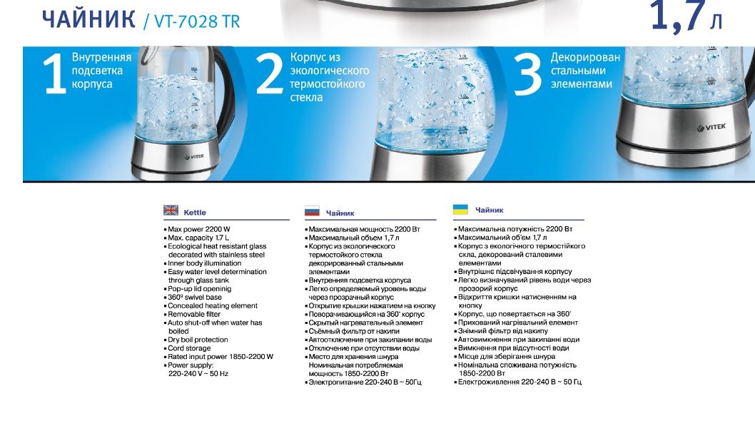 Корпус из экологического термостойкого стекла декорированный стальными элементами. Внутренняя подсветка корпуса. Легко определяемый уровень воды через прозрачный корпус. Открытие крышки нажатием на кнопку. Поворачивающийся на 360С корпус. Скрытый нагревательный элемент. Съемный фильтр от накипи. Автоотключение при закипании воды. Отключение при отсутствии воды.