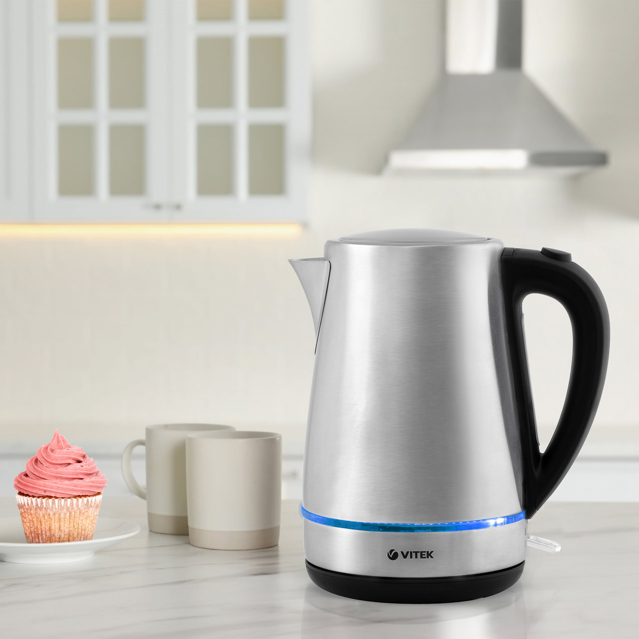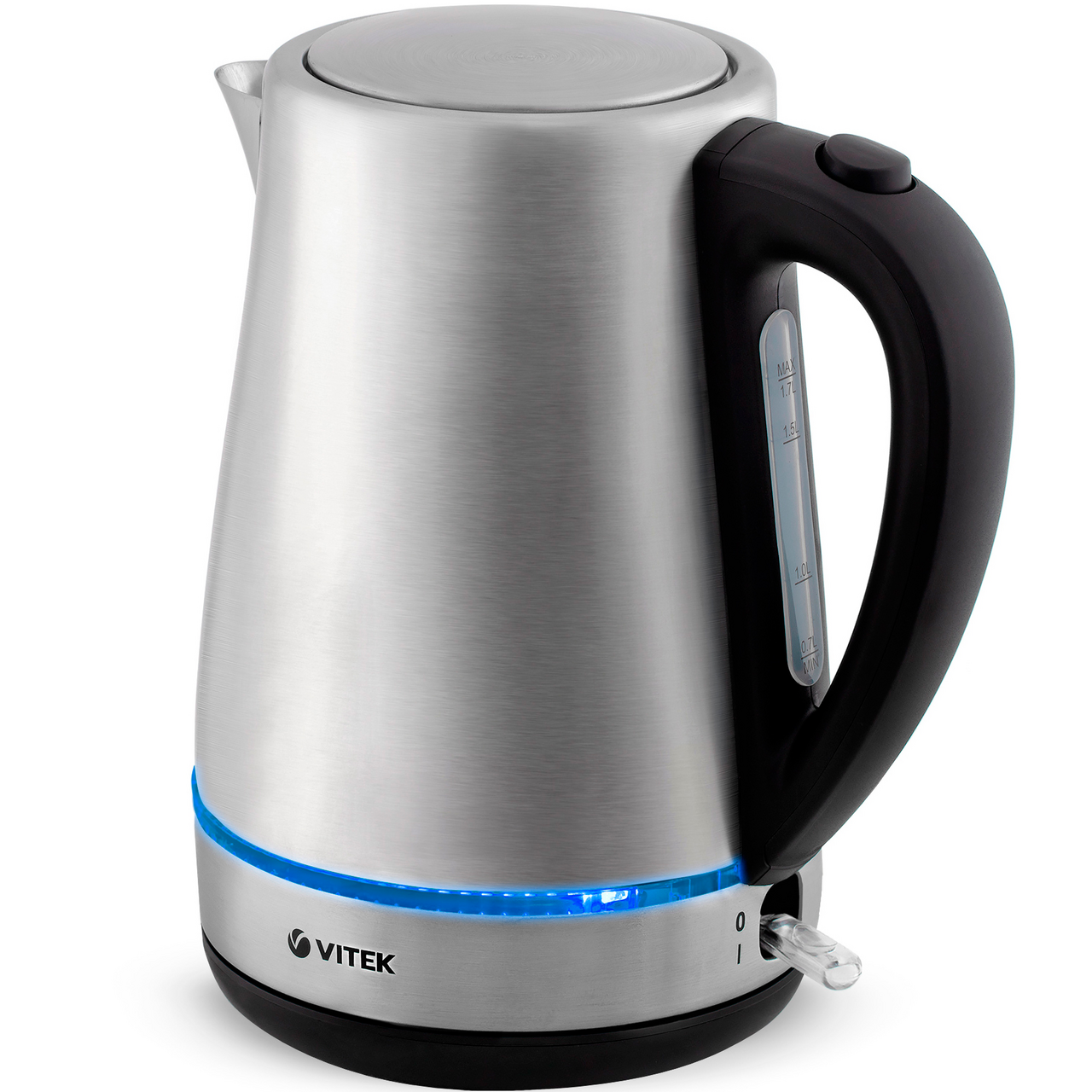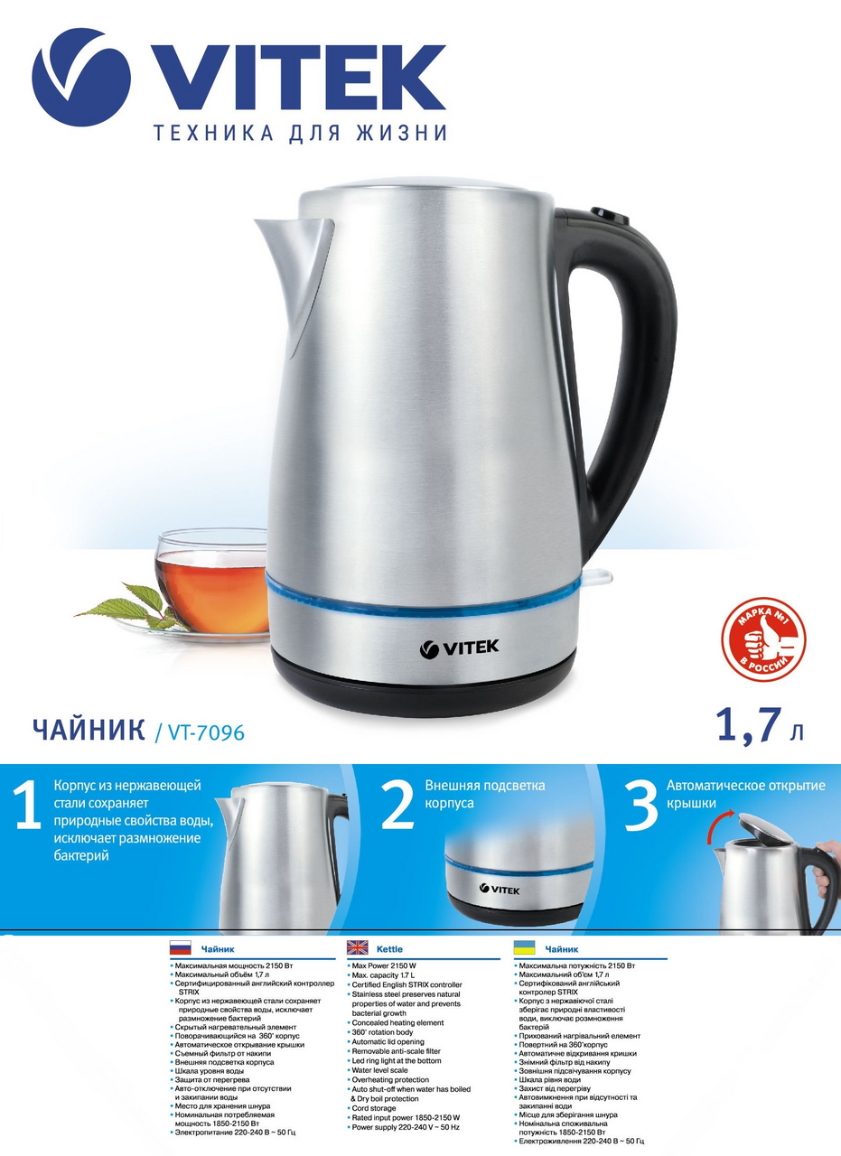 Чайник Vitek VT-7096 обеспечит быстрое закипание воды. Для этого потребуется всего несколько минут. Электрочайник снабжен мощным нагревательным элементом. Работает бесшумно. Он станет украшением любой кухни. Его можно поставить на барную стойку в кафе, барах, ресторанах и других заведениях общественного питания. Эта модель привлекает внимание стильным дизайном. У него классическая форма. Во время работы включается приятная для глаз синяя подсветка. Она одинаково эффектно смотрится при дневном свете и в темноте. Вода закипает в считаные минуты благодаря мощности в 2200 Вт. Пользоваться прибором удобно. Он соответствует всем требованиям безопасности. Чайник не включается при отсутствии воды и автоматически выключается при ее закипании, что предотвращает его перегрев или перегорание деталей. Нагрев обеспечивает закрытая спираль. Металлическая колба не подвержена коррозии и сохраняет органолептические свойства воды. Ее производят из материала, устойчивого к воздействию высоких температур. Пластиковая ручка не нагревается в процессе эксплуатации, что исключает риск ожога. В носике имеется нейлоновый фильтр, который препятствует попаданию мелких частиц внутрь прибора. В приборе установлен контроллер STRIX, который существенно увеличивает срок эксплуатации. Крышка откидная, срабатывает при нажатии кнопки. Прозрачная вставка с мерной шкалой позволяет визуально контролировать уровень воды. Ухаживать за изделием очень просто. В инструкции имеются рекомендации производителя для удаления накипи, которая может появиться при использовании воды с высокой жесткостью и наличием примесей.