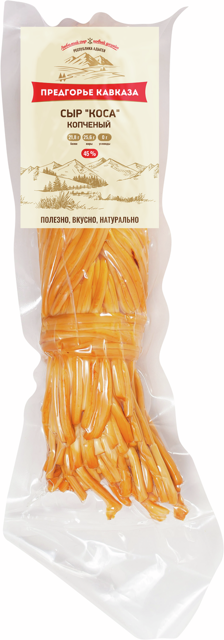 Сыр Предгорье Кавказа чечил коса копченый, 180г БЗМЖ – качественный и вкусный продукт из Адыгеи. Продукт выпускается в оригинальной форме косички. Такую упаковку очень удобно взять на пикник, все готово к употреблению и не требует предварительного нарезания. Изготовлен по строгой технологии из свежих ингредиентов без использования жидкого дыма. Вкус натурального копченого сыра, не перегруженного солью. Продукт прекрасно подойдет к хмельным напиткам, а также для повседневного безалкогольного употребления. Сыр хорошо сочетается с овощами, морской капустой, зеленью. Настоящие гурманы употребляют его с какао, кофе или сливками.