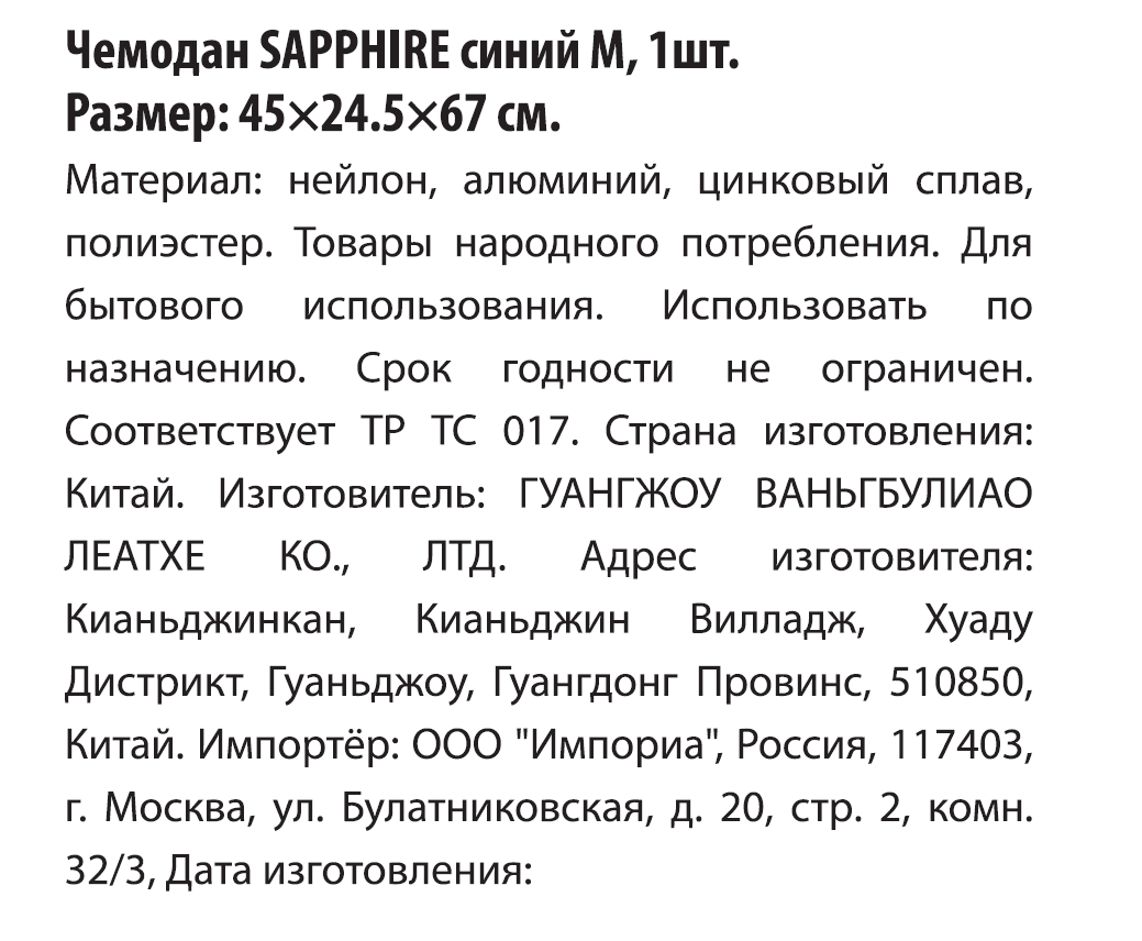 Чемодан Sirocco Sapphire 4К полиэстер синий M, 67 x 45 x 24.5см