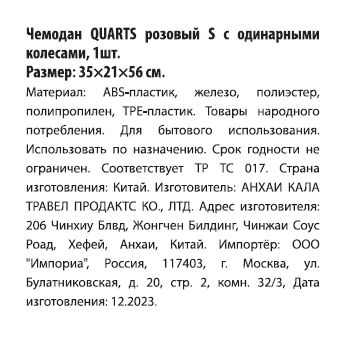 Чемодан Sirocco Quarts 4К ABS розовый S, 35 x 21 x 56см