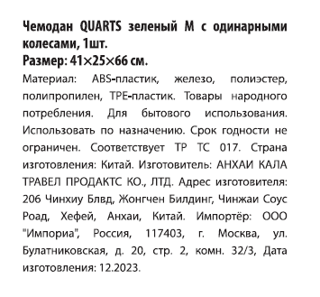Чемодан Sirocco Quarts 4К ABS зеленый M, 41 x 25 x 66см