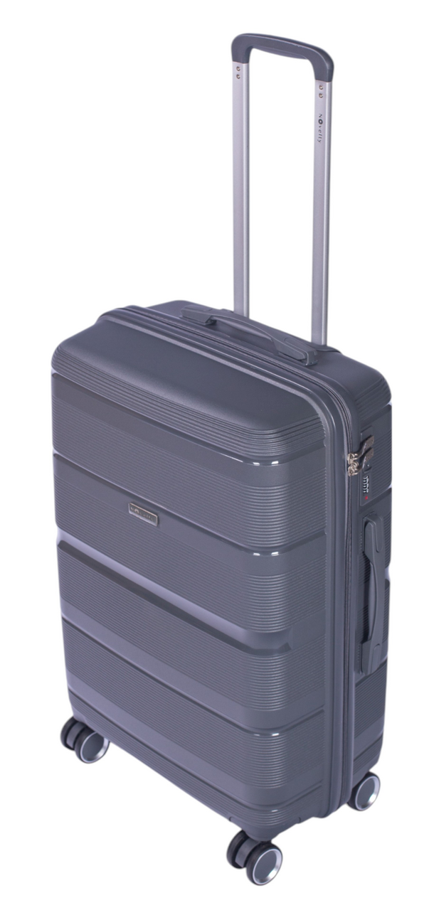 Чемодан Novelty Lines M темно-серый PP c двойными колесами идеально подойдет для путешествий. Этот дорожный аксессуар среднего размера станет надежным спутником в поездках. Он подходит как для женщин, так и для мужчин, сочетая стиль и функциональность. Изготовленный из ударопрочного полипропилена, чемодан обеспечивает высокий уровень защиты вашего багажа от повреждений. Неубиваемый корпус сохранит вещи в целости и сохранности даже при самых нестабильных условиях перевозки. Легкий и удобный чемодан небольшого размера поможет избежать лишней нагрузки во время длительных поездок. Встроенная телескопическая ручка облегчает транспортировку. Простое управление благодаря двойным надежным колесикам с вращением на 360 делает каждую поездку еще более комфортной и беззаботной. Чемодан идеально подходит как для деловых командировок, так и отдыха с семьей или друзьями.