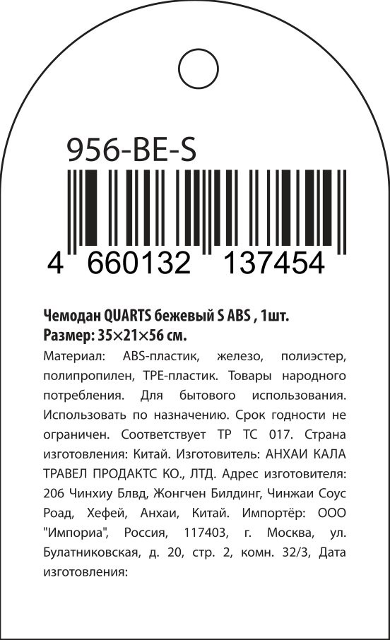 Чемодан Sirocco Quarts бежевый ABS размер S, 55 x 36 x 23см