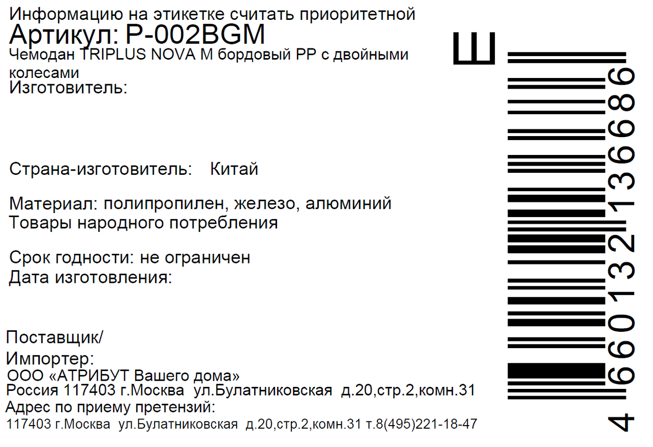 - Комплектация Чемодан - 1 шт.