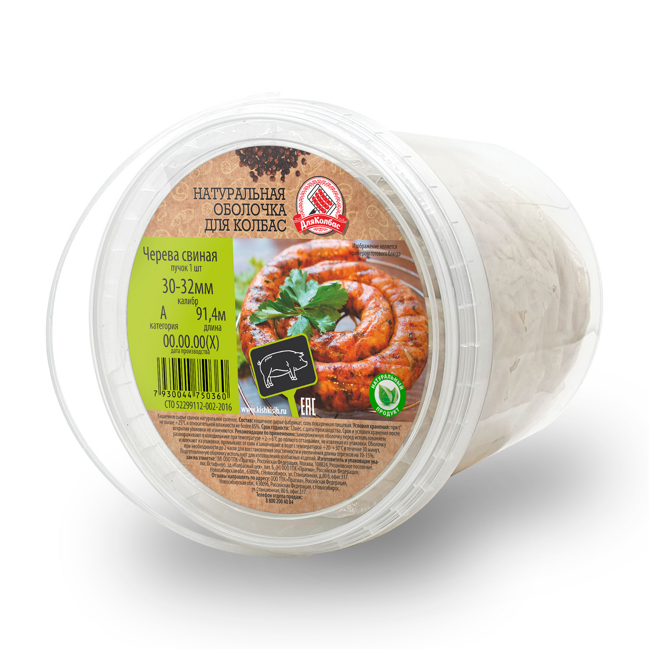 Натуральная оболочка свиная - один из самых узких калибров свиной черевы, отлично подходит для приготовления колбасок для жарки, так как тонкие изделия быстрее прожариваются. Такой вид черевы так же используют для приготовления тонких сыровяленых и сырокопченых колбасок. После термической обработки продукта оболочку чаще всего употребляют с получившимся колбасным изделием. Способы приготовления: Жарка, вяление, варка, запекание, гриль, копчение.