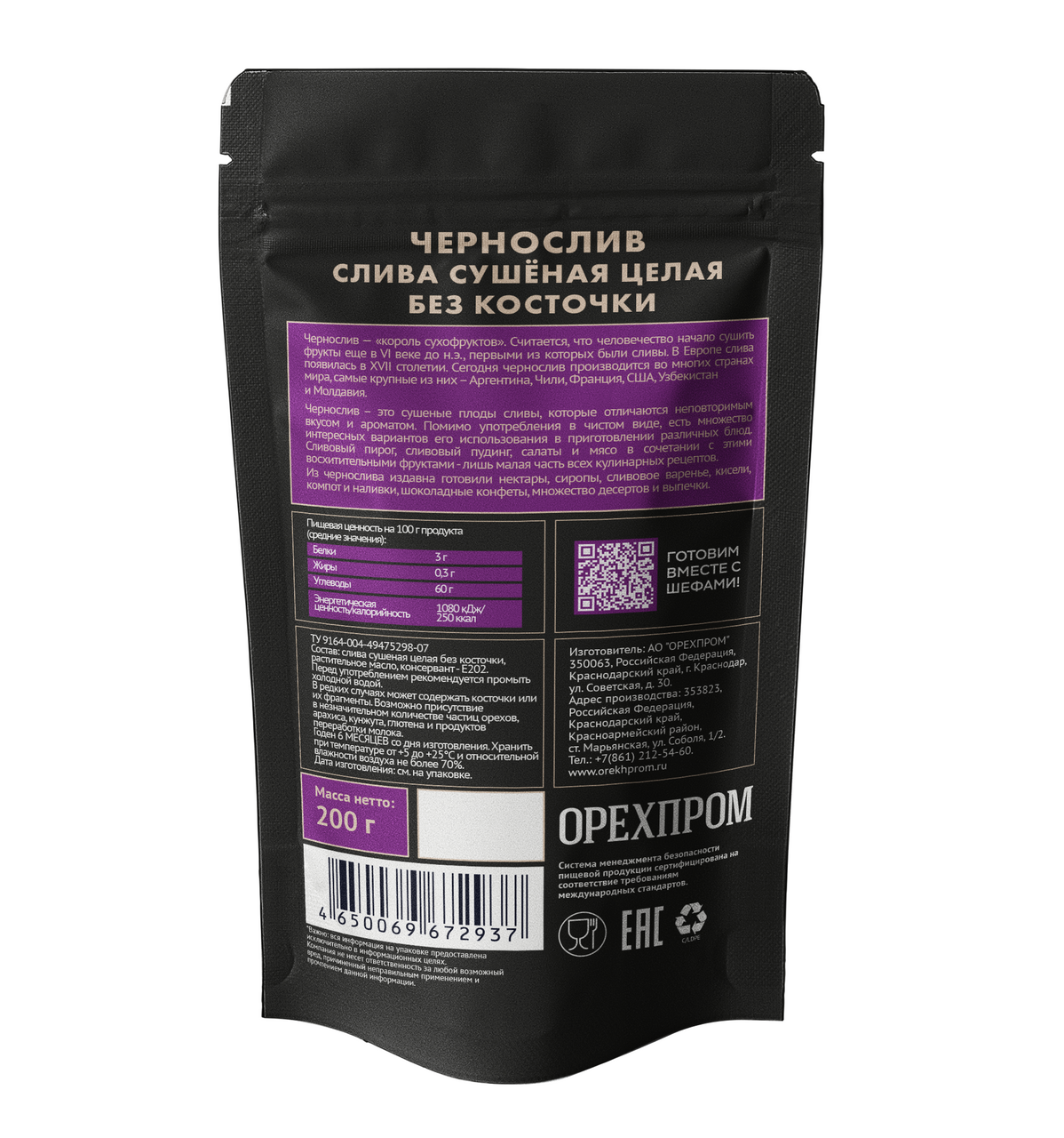 Слива сушеная целая без косточки. Отборный продукт для истинных ценителей качества в классической стильной упаковке удобного формата. Обладая прекрасными вкусовыми качествами, чернослив оказывает благоприятное действие на организм, используется во многих современных диетах. Чернослив практически полностью сохраняет полезные вещества, входящие в состав свежей сливы. Продукт готов к употреблению.