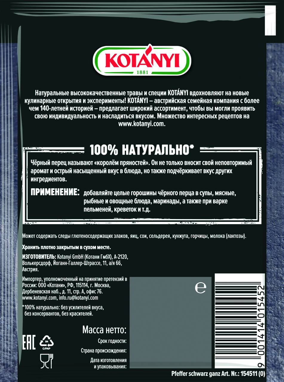 Черный перец горошек Kotanyi, 20 г – острая, душистая приправа, которую добавляют в самые разные кулинарные блюда, начиная от супов и вторых блюд, заканчивая приготовлением изысканного молотого кофе. Это плод индийской лианы, культивируемой в тропиках. Пряность бывает четырех разновидностей: черный, белый, зеленый и розовый перец. Причем, их все получают с одной культуры. Это ароматная приправа к пище, в состав которой входит большой перечень биологически активных компонентов. В нем в огромном количестве содержится витамин К, В5, В6, микроэлементы: марганец, медь, магний, кальций. Также в составе присутствуют бета-каротин, ретинол, фолиевая кислота. Регулярное использование в пищу черного перца подавляет активность воспалительных процессов, усиливает перистальтику кишечника, позволяет быстрее выводить шлаки и токсины, нормализует обмен веществ.