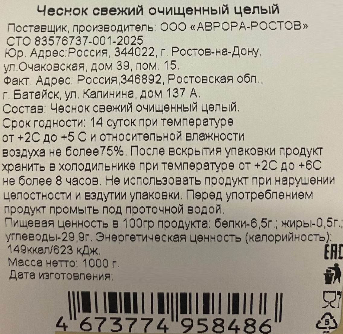 Чеснок Аврора-Ростов очищенный целый, 1кг