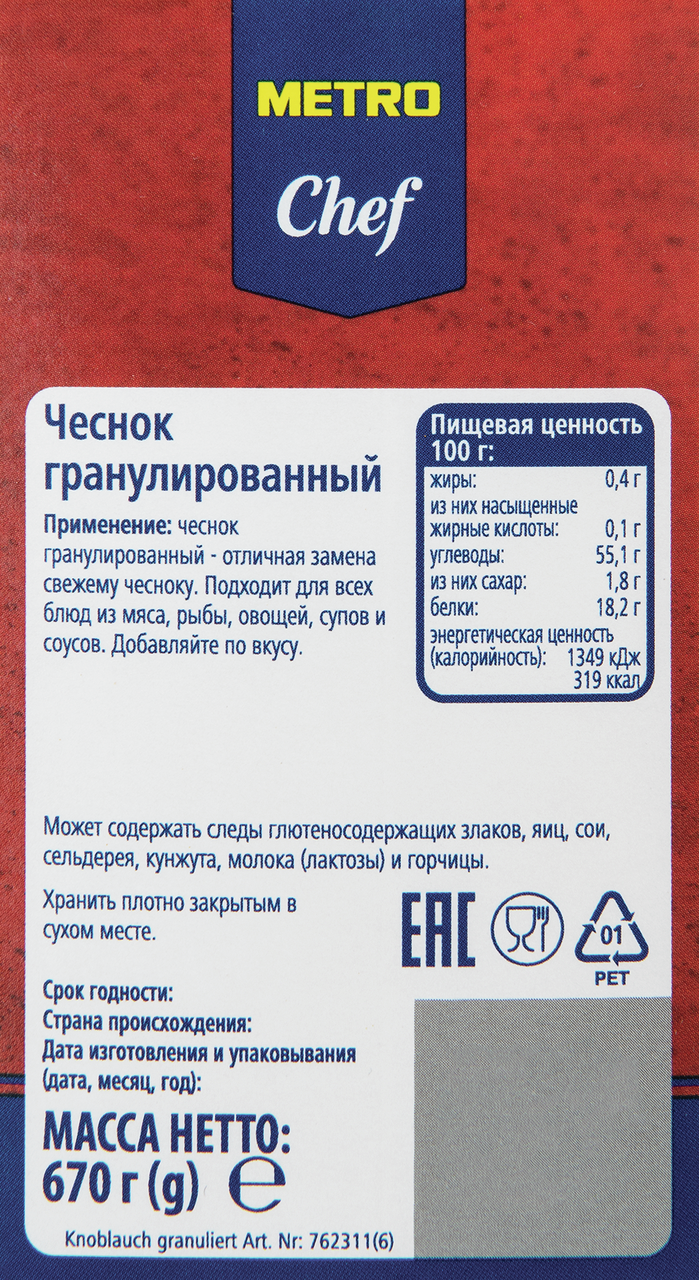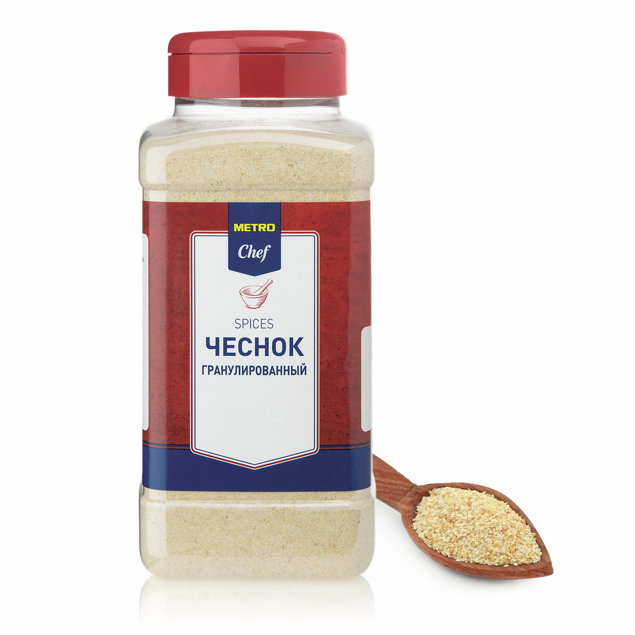 Чеснок гранулированный METRO Chef, 670 г — пожалуй, самая популярная приправа во всем мире. Он прекрасно дополняет вкус блюд из мяса и птицы, овощей, картофеля, а также супов и бульонов, морепродуктов и гарниров. Эту пряность принято добавлять в соусы и маринады, в заправки для салатов и закуски. Также чеснок применяется в выпечке — обжаривается на растительном масле и используется для посыпки свежих булочек и хлеба. Представленная специя обладает рядом лечебных свойств: стимулирует заживление ран, благоприятно влияет на сердце и сосуды, понижает артериальное давление, препятствует образованию тромбов и снижает уровень холестерина в крови. Чеснок стимулирует работу желудочно-кишечного тракта, а еще отличается противопаразитарным и антимикробным действием.