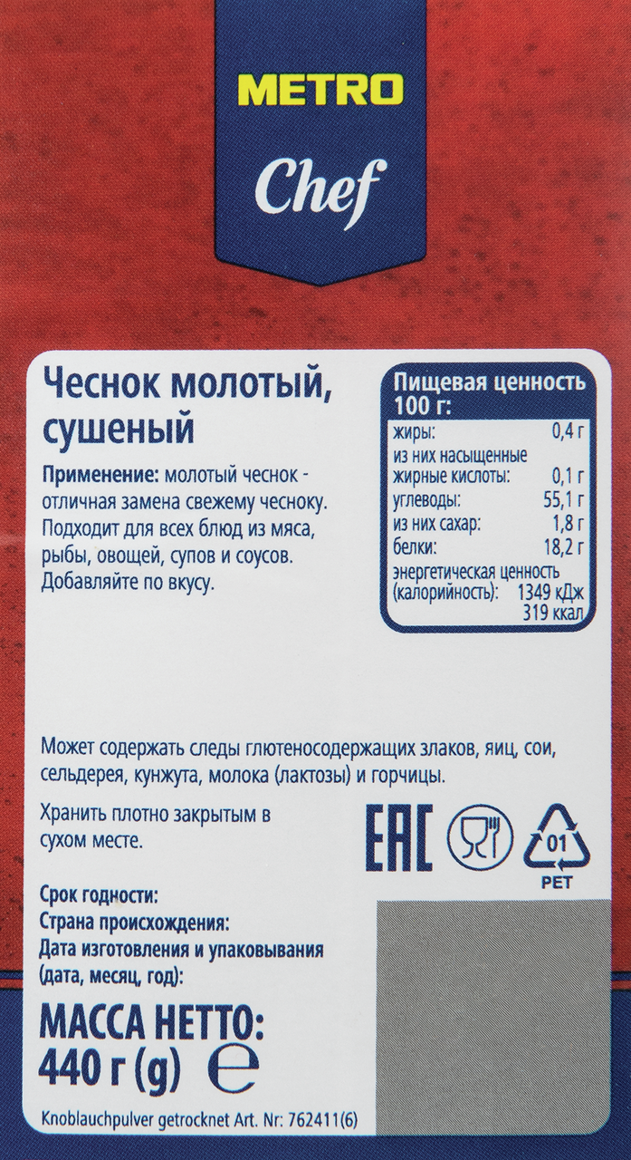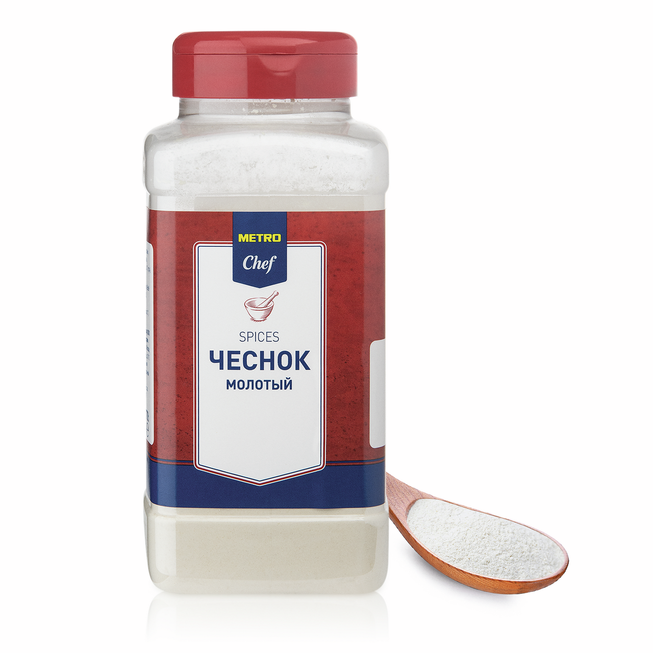 Чеснок порошок METRO Chef, 440 г— пожалуй, самая популярная приправа во всем мире. Он прекрасно дополняет вкус блюд из мяса и птицы, овощей, картофеля, а также супов и бульонов, морепродуктов и гарниров. Эту пряность принято добавлять в соусы и маринады, в заправки для салатов и закуски. Также чеснок применяется в выпечке — обжаривается на растительном масле и используется для посыпки свежих булочек и хлеба. Представленная специя обладает рядом лечебных свойств: стимулирует заживление ран, благоприятно влияет на сердце и сосуды, понижает артериальное давление, препятствует образованию тромбов и снижает уровень холестерина в крови. Чеснок стимулирует работу желудочно-кишечного тракта, а еще отличается противопаразитарным и антимикробным действием. Представленного вес�� хватит на долгое время с учетом экономичного расхода чеснока.
