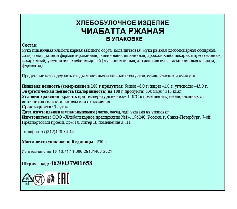 Мука пшеничная хлебопекарная высшего сорта, вода питьевая, мука ржаная хлебопекарная обдирная, соль, солод ржаной ферментированный, клейковина пшеничная, дрожжи хлебопекарные прессованные, сахар белый, улучшитель хлебопекарный (мука пшеничная, антиокислитель - аскорбиновая кислота, ферменты).