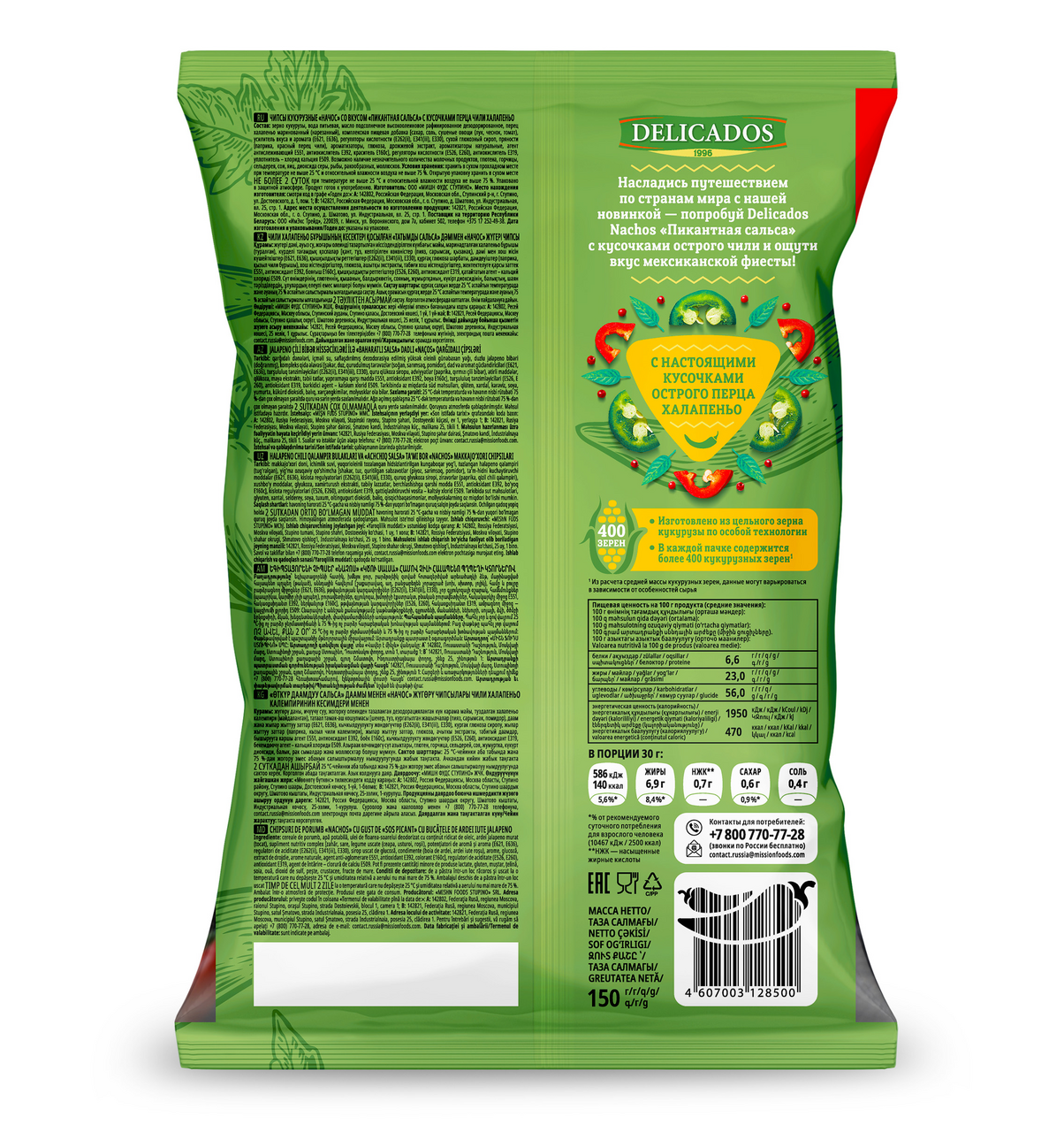 Зерно кукурузы, вода питьевая, масло подсолнечное высокоолеиновое рафинированное дезодорированное, перец халапеньо маринованный (нарезанный), комплексная пищевая добавка [сахар, соль, сушеные овощи (лук, чеснок, томат), усилитель вкуса и аромата (Е621, Е636), регуляторы кислотности (Е262(ii), Е341(iii), Е330), сухой глюкозный сироп, пряности (паприка, красный перец чили), ароматизаторы, глюкоза, дрожжевой экстракт, ароматизаторы натуральные, агент антислеживающий Е551, антиокислитель Е392, краситель Е160с], регуляторы кислотности (Е526, Е260), антиокислитель Е319, уплотнитель – хлорид кальция Е509.