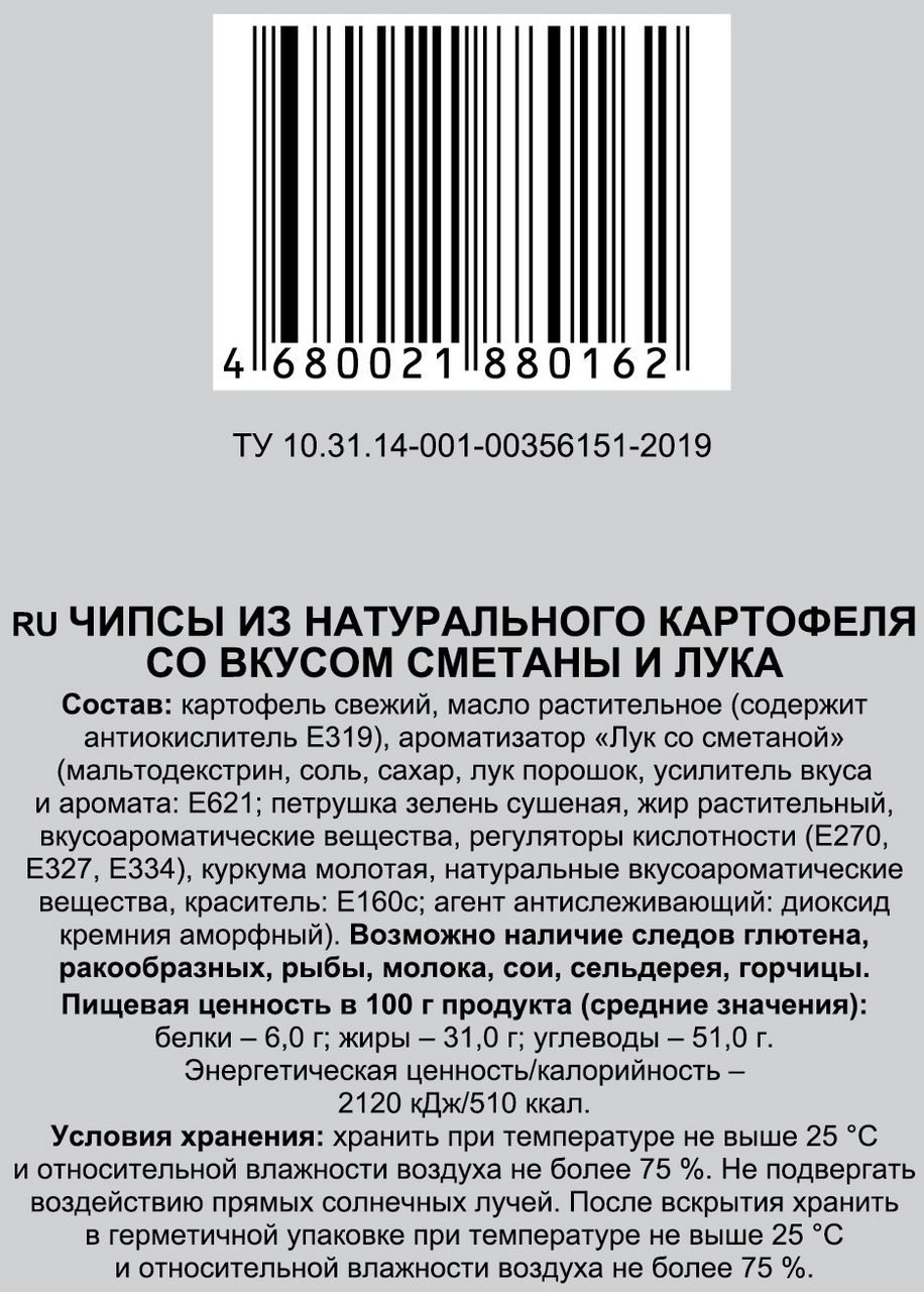 Картофель свежий, масло подсолнечное (содержит антиокислитель Е319), ароматизатор Лук со сметаной (мальтодекстрин, соль, сахар, лук порошок, усилитель вкуса и аромата: Е621; петрушка зелень сушеная, жир растительный, вкусоароматические вещества, регуляторы кислотности (Е270, Е327, Е334), куркума молотая, натуральные вкусоароматические вещества, краситель: Е160с; агент антислеживающий: диоксид кремния аморфный).